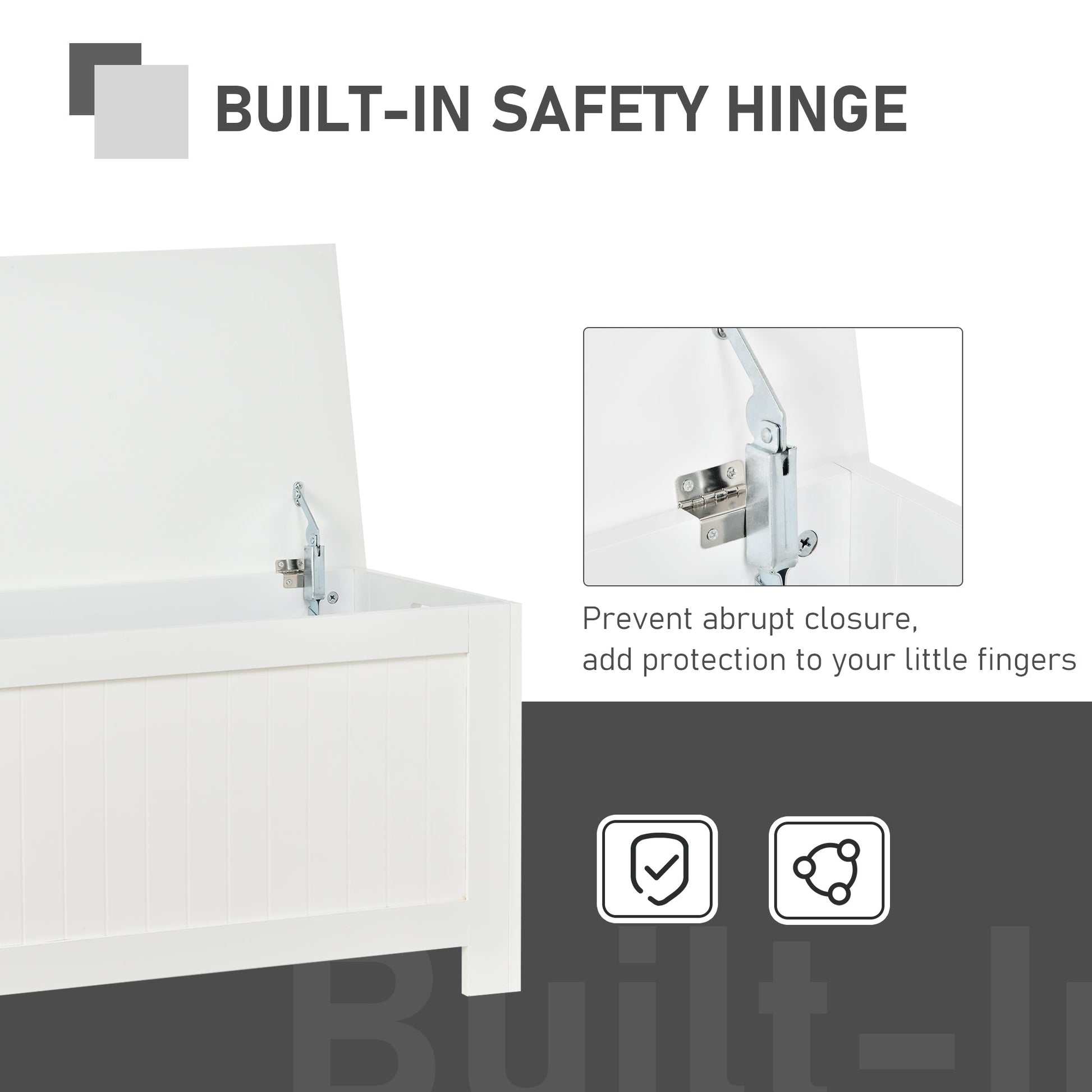 - Safety hinges protect fingers from getting caught when opening and closing the lid