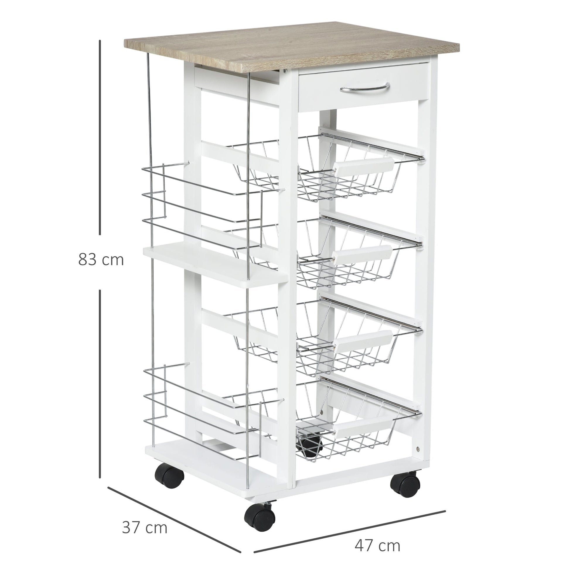 HOMCOM Rolling Kitchen Cart, Utility Storage Cart with 4 Basket Drawers & Side Racks, Wheels for Dining Room, Natural and White