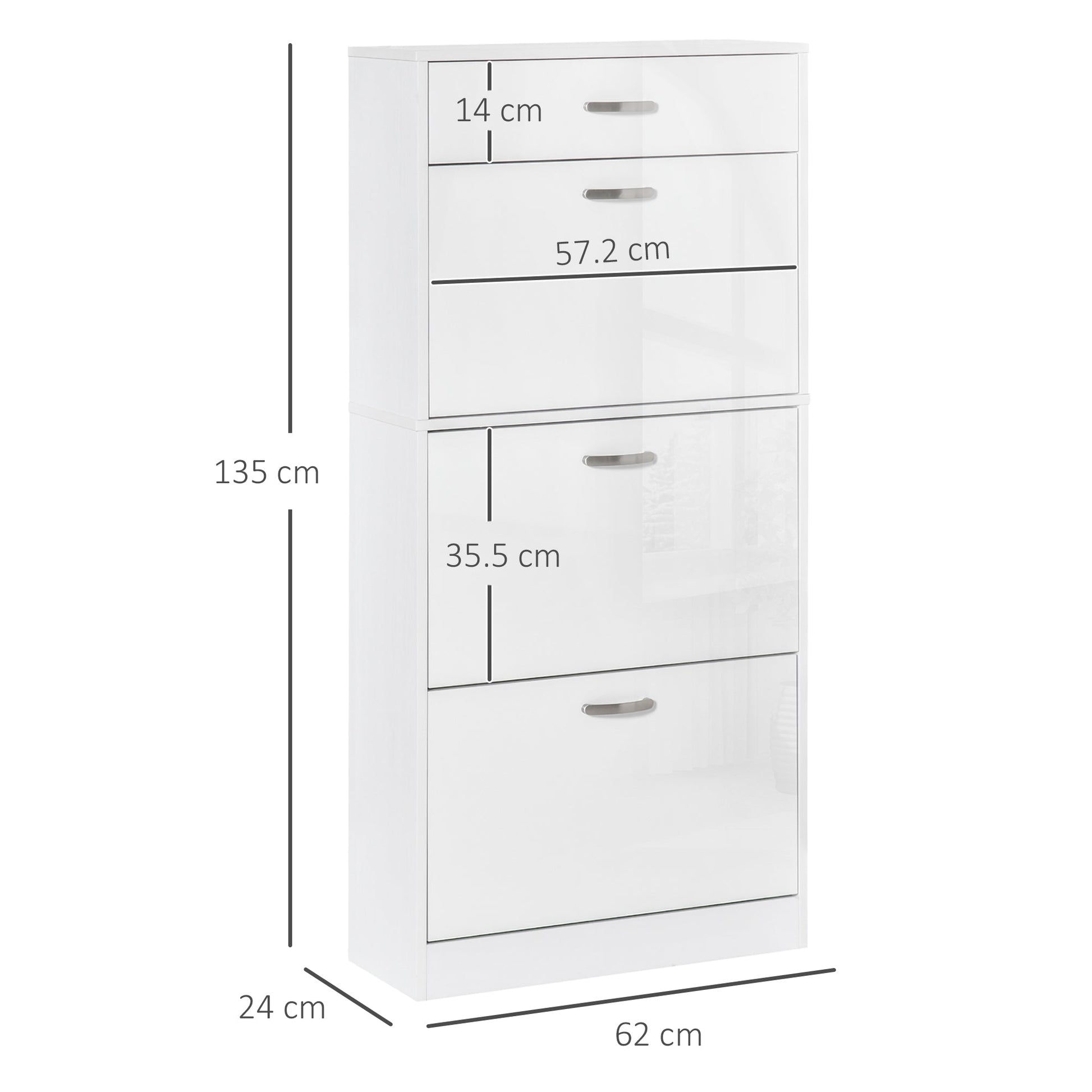 Choose this shoes cabinet from HOMCOM will keep your home tidy. There are three flip drawers, each can hold six pairs - perfect for use with the family or your flatmates. The inner shelf can be set to two different positions for storage which fits your shoes better. Finished with a handy top drawer, offering even more storage. The high gloss shoe storage unit in modern style is a great addition to your home.