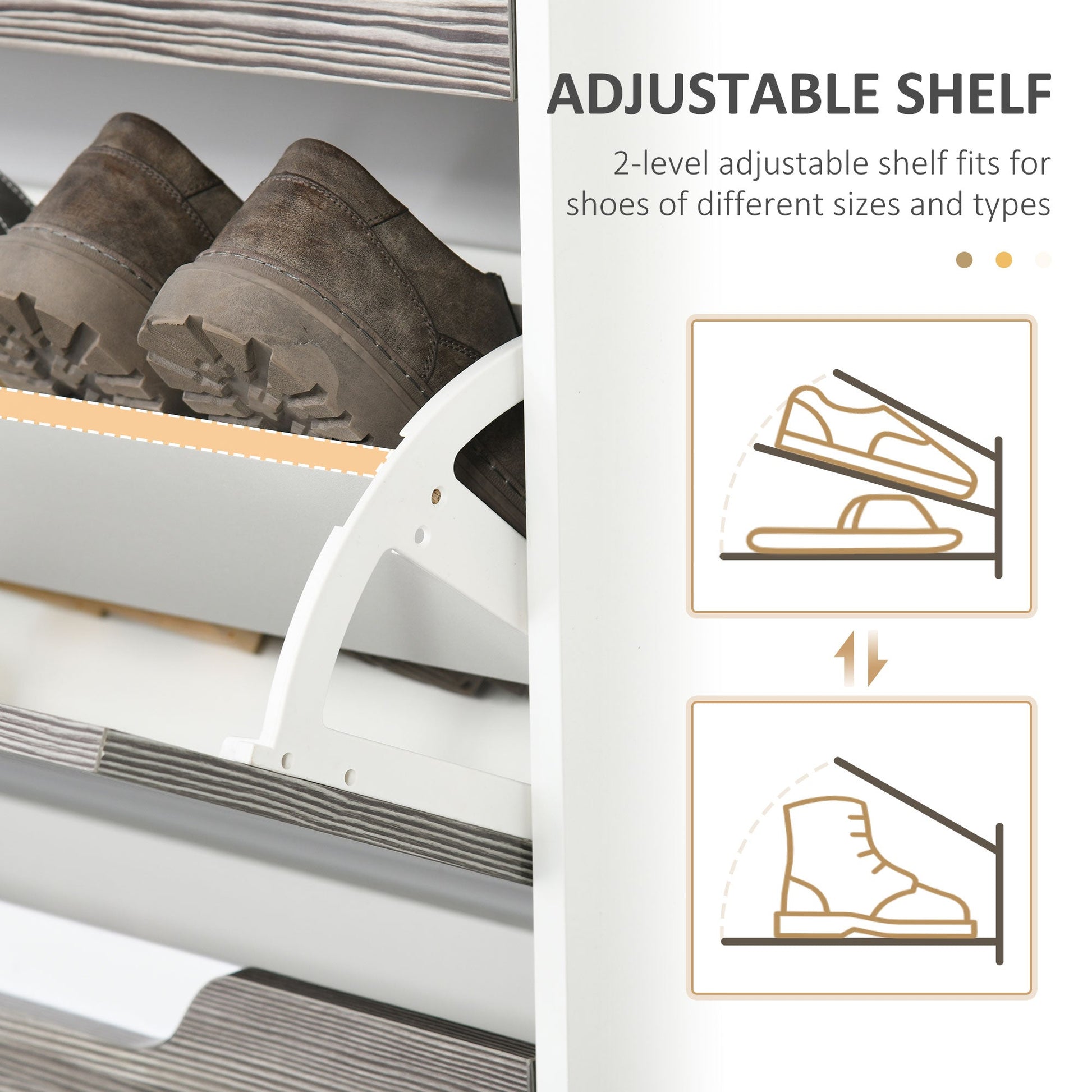 Give shoes and more somewhere stylish and protective to keep them - grab this narrow shoe cabinet from HOMCOM. There are two flip drawers, each can hold eight pairs - great for use with the family or your flatmates. The inner shelf can be set to two different positions for storage, which fits your shoes better. This tall shoe cabinet is made from a blend of MDF and particle board, so it's robust. Finished with a handy top drawer and glass shelf, offering even more storage and display space.