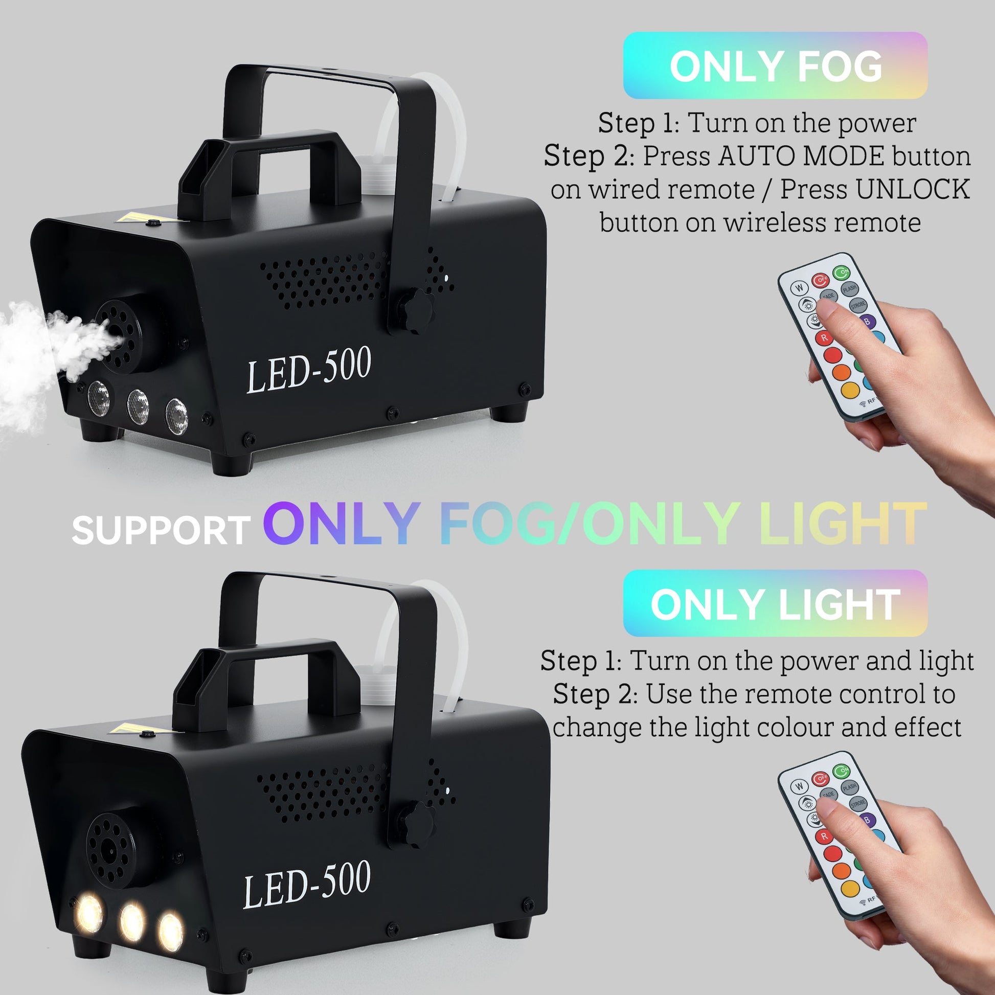 - Two wireless remotes to control the fog and lighting effects