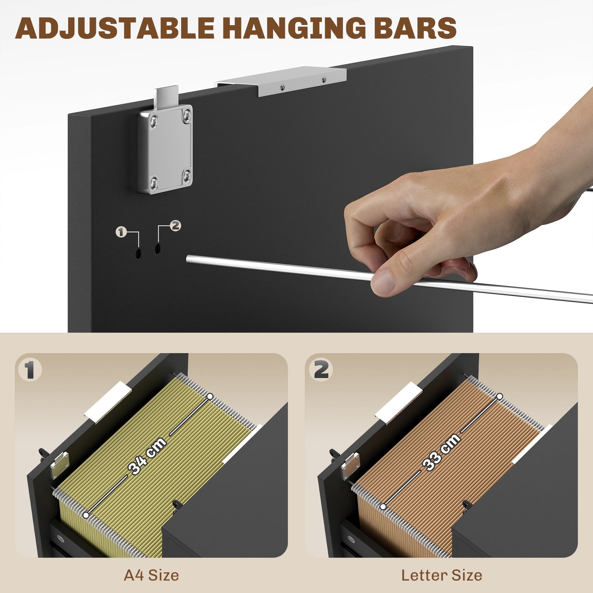 Keep your workspace tidy and stylish with this HOMCOM lockable filing cabinet. It comes with a small drawer and a large drawer for file storage; adjustable bars in the large drawer to hold A4/letter-sized files. The lockable drawers ensure your documents stay secure, with two keys included. Office drawers with compact design, enhanced with five wheels for easy mobility, allows it to fit snugly under your desk.