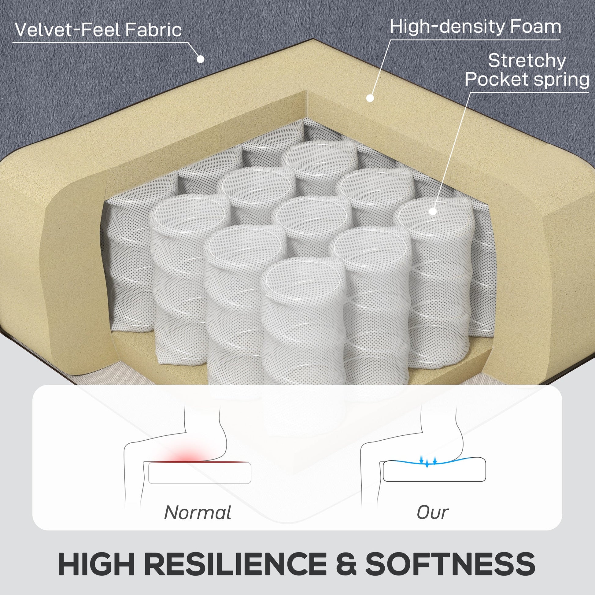 - Thick foam padding and pocket springs for comfort and support