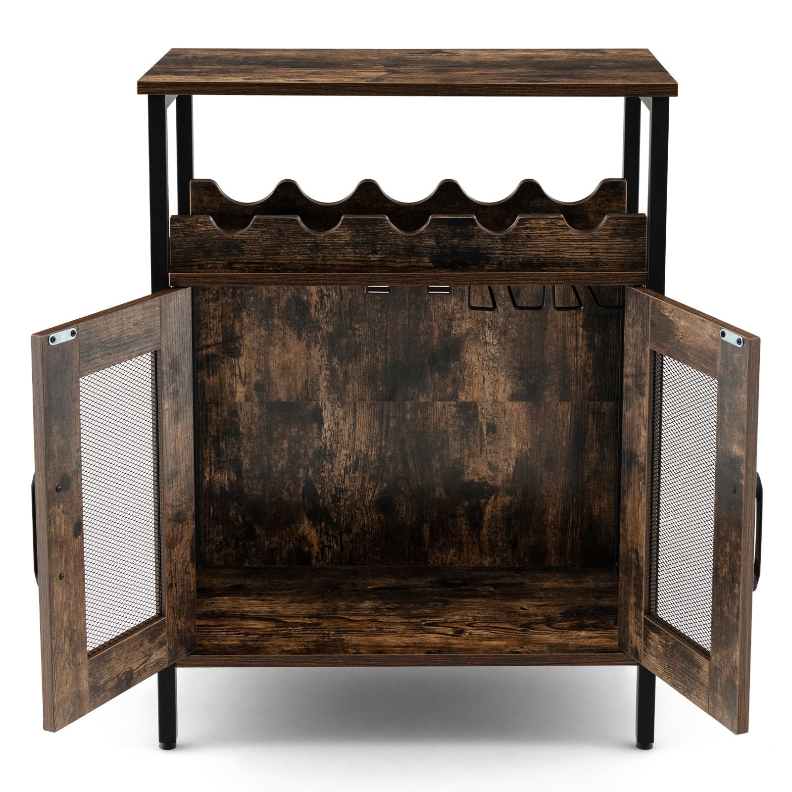 This industrial bar cabinet features various storage spaces to fully meet your requirements. Featuring a tabletop, wine rack, and mesh door cabinet, the sideboard has ample storage space to store ornaments, coffee machine, and dinnerware. Besides, the wine rack holds up to 5 wine bottles and glass holders store up to 6 wine glasses. You can remove the wine rack and glass holders for more storage. The 2-in-1 design meets your different needs. Made of firm and durable material, the wine bar can be used for a long time. The metal legs with adjustable foot pads enhance stability and keep balance. Moreover, the anti-toppling kit will keep the coffee cabinet stable and protect your safety. With exquisite workmanship and industrial style, the freestanding sideboard adds fashion and classic beauty to your home. This floor liquor cabinet can not only serve as a wine bar/coffee cabinet in the living room but also as a storage sideboard for the dining room or kitchen. If you are looking for a bar cabinet like this, do not hesitate to place an order! Detachable Wine Rack and Stemware Holders: This industrial cabinet comes with a detachable wine rack, which can hold up to 5 bottles of wine. What's more, 2 removable stemware holders can be installed under the middle shelf to accommodate 6 wine glasses. This wine bar cabinet can suit wine lovers' daily storage needs. Sturdy and Durable Construction: Constructed from premium engineered wood panels and a robust metal frame, this heavy-duty sideboard with premium shelves features strong load bearing. The surface is smooth without burrs, and easy to clean and maintain, providing long-term use. Adjustable Feet and Anti-tipping Device: The feet can be adjusted to deal with rough grounds and make the storage cabinet not easy to shake. Additionally, you can also assemble the anti-tipping accessories to prevent the cabinet from tipping over and ensure safety. More than a Wine Cabinet: This compact buffet cupboard features ample storage space and wide applications, which is suitable for various occasions. Users can detach the wine rack or glass holder, and use this liquor cabinet as a coffee bar cabinet, sideboard, or storage cabinet. Easy Assembly and Maintenance: All the necessary hardware and a detailed user manual will be included in the package. You just need to connect all the parts by tightening the screws to complete the assembly. When it comes to daily maintenance, you can just clean it with a soft rag for great convenience.