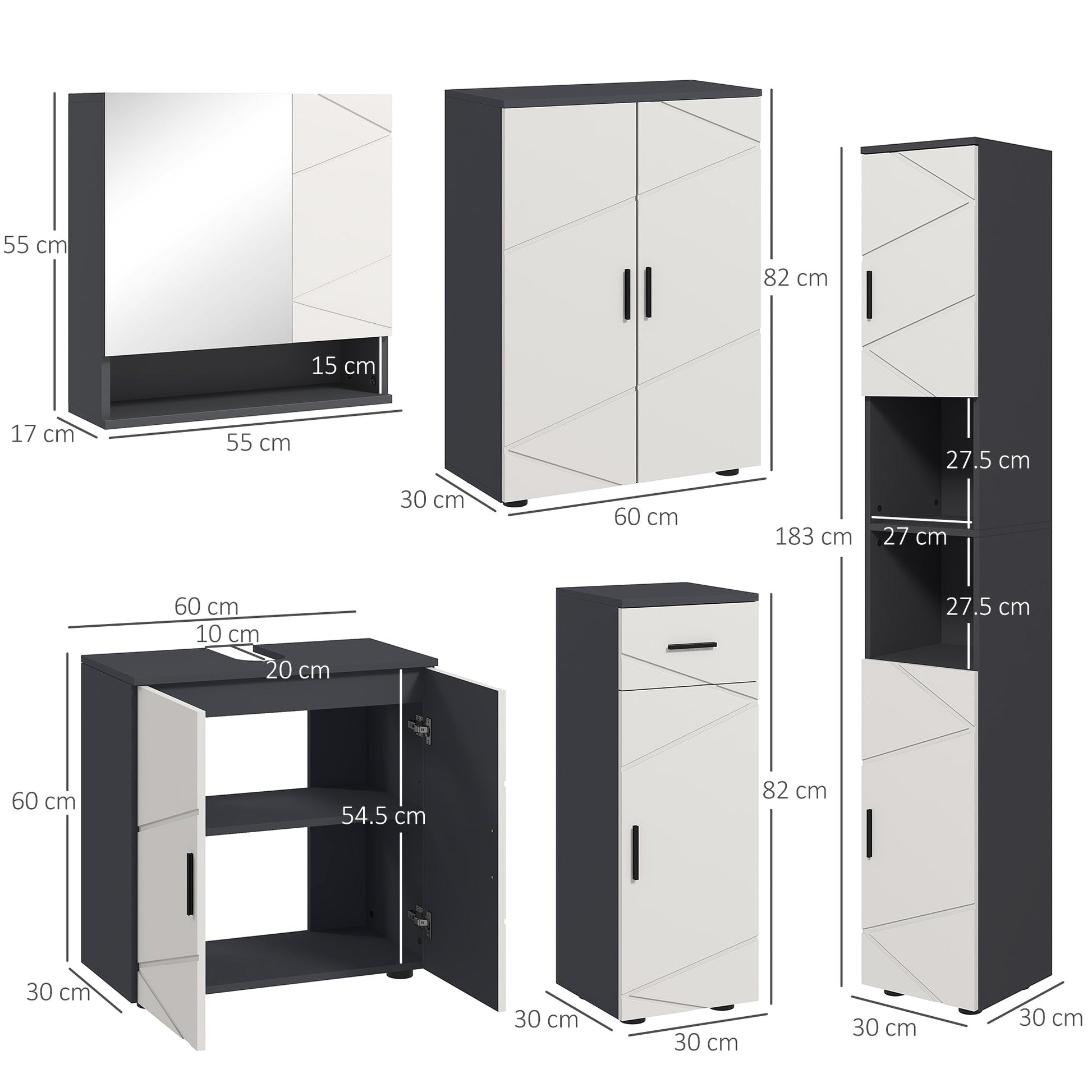 Transform your bathroom with the kleankin 5-piece bathroom furniture set. This chic ensemble includes a tall storage cabinet, two cosy floor cabinets, an under sink cabinet and a sleek mirror cabinet, all designed for maximum storage with multiple shelves. The adjustable inner shelves cater to your storage needs, while the smooth, easy-to-clean surface and anti-tipping design add a touch of safety and style to your space.