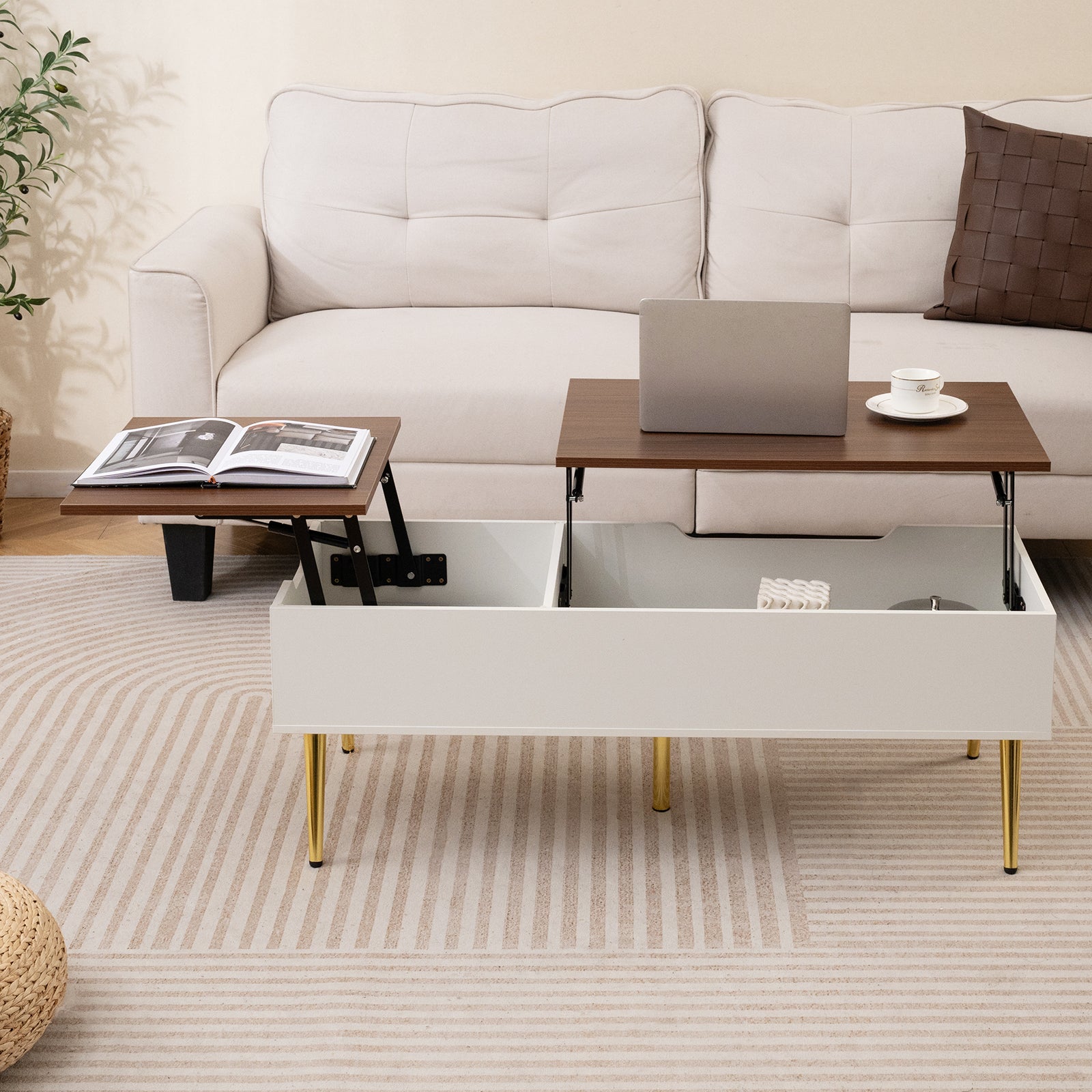 Featuring a lift top mechanism, the center table effortlessly transitions from a standard coffee table to a raised workstation or dining area. There are 2 hidden storage compartments under the wide tabletop to keep your space clutter-free. The robust metal legs present long-lasting use while anti-slip foot pads prevent the floor from scratches. Notably, this versatile coffee table with lifting top can seamlessly integrate into various interior themes. If you are looking for a lift top coffee table like this, do not hesitate to place an order! Convenient Lift-top Design: Once raised, the desktop of this coffee table can extend to a height of 53cm. This optimal height also provides a generous workspace or dining surface. The gas struts lifting mechanism features soft-close design that ensures safe and smooth operation. Ample Storage Space: 2 lifting tabletops offer ample space to accommodate your necessities, from books and laptop to snacks and drinks. Below the tabletops, you will discover 2 hidden storage compartments, keeping items out of sight for a tidy living area. Reliable Construction: Supported by 5 metal legs with non-slip foot pads, this flip top coffee table boasts great sturdiness and stability. The strong build supports up to 75 kg (table surface when not lifted), making it a reliable centerpiece in any room. All-purpose Versatility: You can use this center table for a variety of purposes - from a comfortable dining table to a work table. Its flexibility and ease of adjustment make it an ideal choice for homes and offices alike. Timeless Appeal: With its clean lines and contemporary design, this lift top coffee table seamlessly blends into any home style. This lift top coffee table is perfect for maximizing storage while adding elegance to your room.