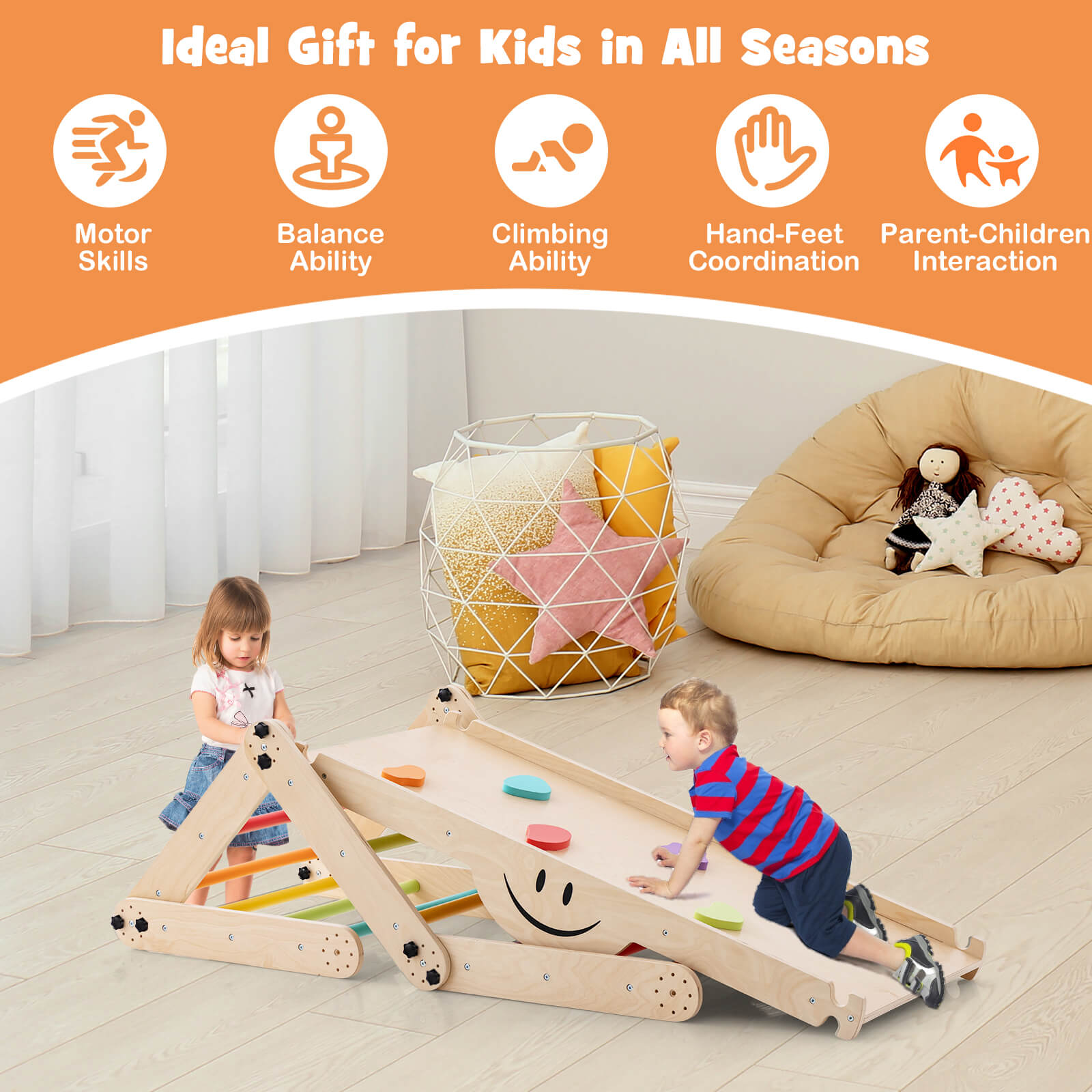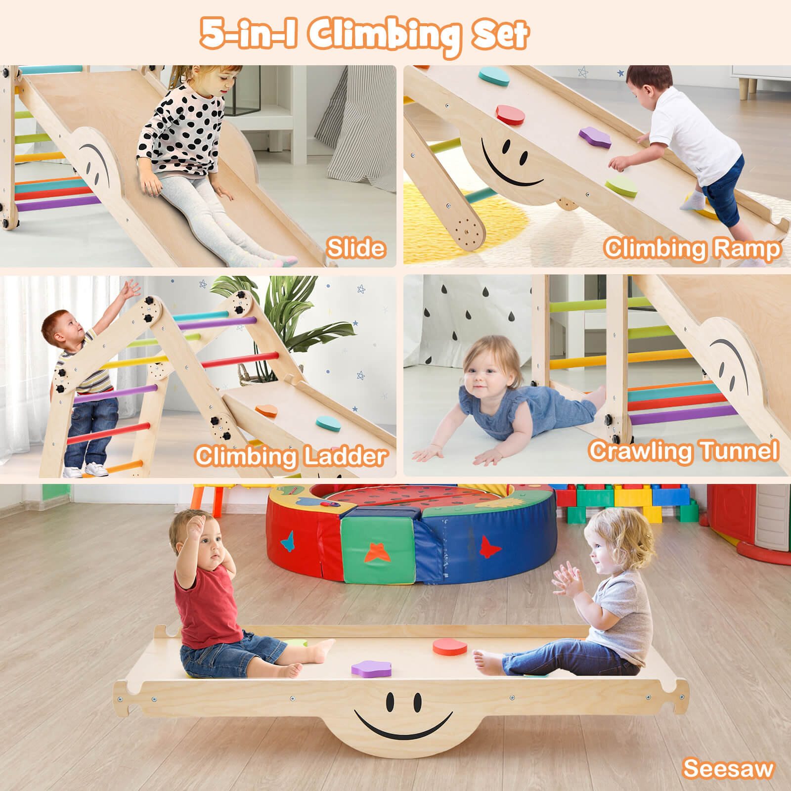 The 5-in-1 climber set contains a convertible climber and a double-sided ramp for kids to climb, crawl or slide. The climber is easy to convert into different shapes to meet kid's different playing needs. And you can adjust the ramp height for sliding or climbing. Moreover, the reversible ramp also functions well as a seesaw for kids to rock. And kids can play it in the kid's room, living room, playroom, kindergarten or nursery. Solid wood bars and colorful climbing rocks help your little one climb. This climber set features premium pine wood material for long-term use and a strong weight capacity of 60kg. Additionally, approved by EN71, it's safe and reliable. After use, the climber can be folded into a compact shape for space-saving storage. If you are looking for such a product, do not hesitate to buy it! 5-In-1 Fun Climbing Set: This multifunctional climbing set features a climber and a double-sided ramp. It can serve as a sliding ramp, a climbing ramp, a climbing ladder, a seesaw and a crawling tunnel. The ramp will function well as a seesaw. The climber can be transformed from a square shape to a peaked shape, offering DIY fun for your kids. Height-Adjustable Ramp: The double-sided ramp is designed with adjustable height for sliding or climbing( low level, middle level or high level). Thus, it will fit children of different ages. Climbing set like one of the foundations of Montessori teachings helps develop kid's independence. Folding Design for Storage: Thanks to the folding devices, you can easily fold the whole climbing set into a narrow shape. Then, you can store it in any corner to save more activity space. Plus, the simple structure allows you to quickly finish assembly. Child-safe and Reliable Materials: All materials are BPA-free and have passed EN71, ensuring safe and reliable use. Solid wood bars guarantee great strength and high durability. The climber set holds up to 60kg. Meanwhile, the rounded and burr-free edges prevent scratching kid's skin. Versatile Climber for Your Kids: If kids are younger, this climber set allows them to practice climbing for bone and muscle development. When your little one gets older, they can use it to imaginatively build different shapes or create their own forts. And it's ideal for the kid's room, living room, playroom, kindergarten, nursery, etc.