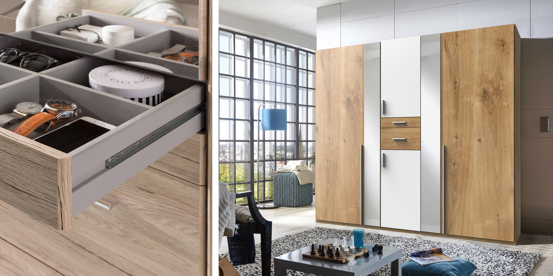 The ODENSE 6 Door wardrobe has a sleek and contemporary look and comes finished with mirrored door. The wardrobe has trendy handles which give it a modern look .The wardrobe has two hanging rail and a top storage shelf and it has total 5 shelves dividing in three sections.