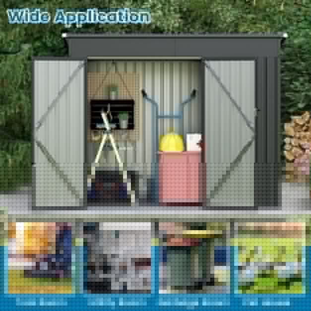 Our all-weather storage shed with a top slope design ensures quick runoff of rainwater. Windproof and waterproof, it features a large front door with a metal latch and catches for security, as well as a side door for added versatility. It will meet various storage needs in your yard or garden. The structure is reinforced with galvanized metal panels and an anti-collision cover. With reinforced triangular anchors ensuring stability, it offers unmatched durability. Attributes: 【Sloped Roof Design】The top sloped roof of this all-weather storage shed ensures rainwater runs off quickly, preventing pooling and maintaining a dry interior. Ideal for rainy days, it is both windproof and waterproof to protect your valuables. 【Double Door Design】Featuring a large front door with premium metal latch and door catches, this garden shed ensures easy access and enhanced security. In addition, the side door also offers versatility and functionality for your storage needs. 【Suitable for Various Contexts】This outdoor storage space can effortlessly transform into a tool shed, laundry room, trash can or pet shed. It meets various storage requirements in your garden, farm or yard. 【Sturdy Structure】Reinforced with galvanized metal panels and anti-collision cover, this heavy duty tool shed ensures the safety of your belongings. In addition, the stable frame, together with the reinforced triangular anchors, provide unmatched durability and stability. 【Details and Dimensions】With security locks and keys, a convenient handle and windows, this shed is carefully designed for user convenience. The overall dimensions are: 235 x 117 x 185 cm (L x W x H).