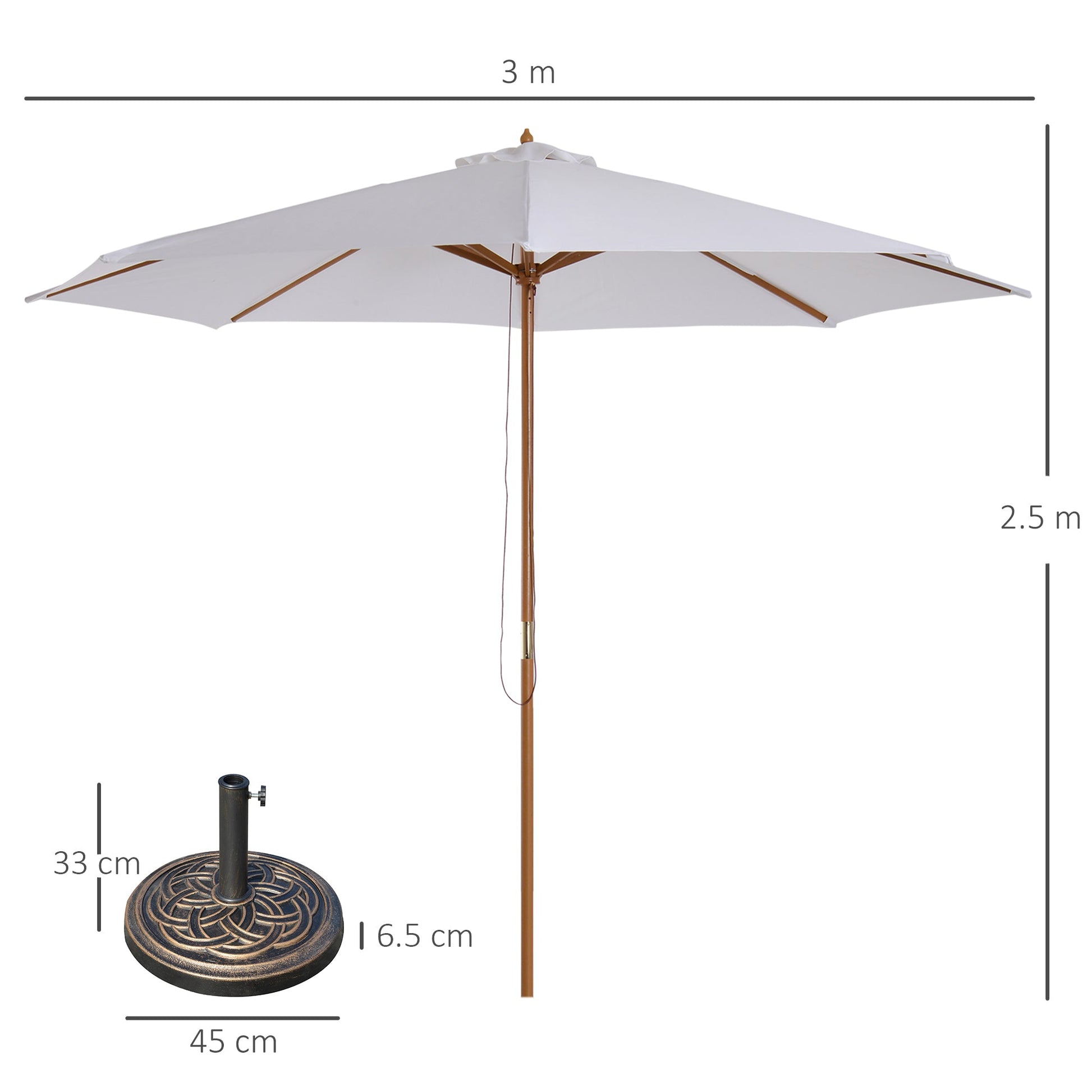 Outsunny 3 m Garden Parasol with Base, Pulley Operated Patio Umbrella, Wooden Parasol, Table Market Umbrella with Rope Pulley Mechanism and 8 Ribs, White