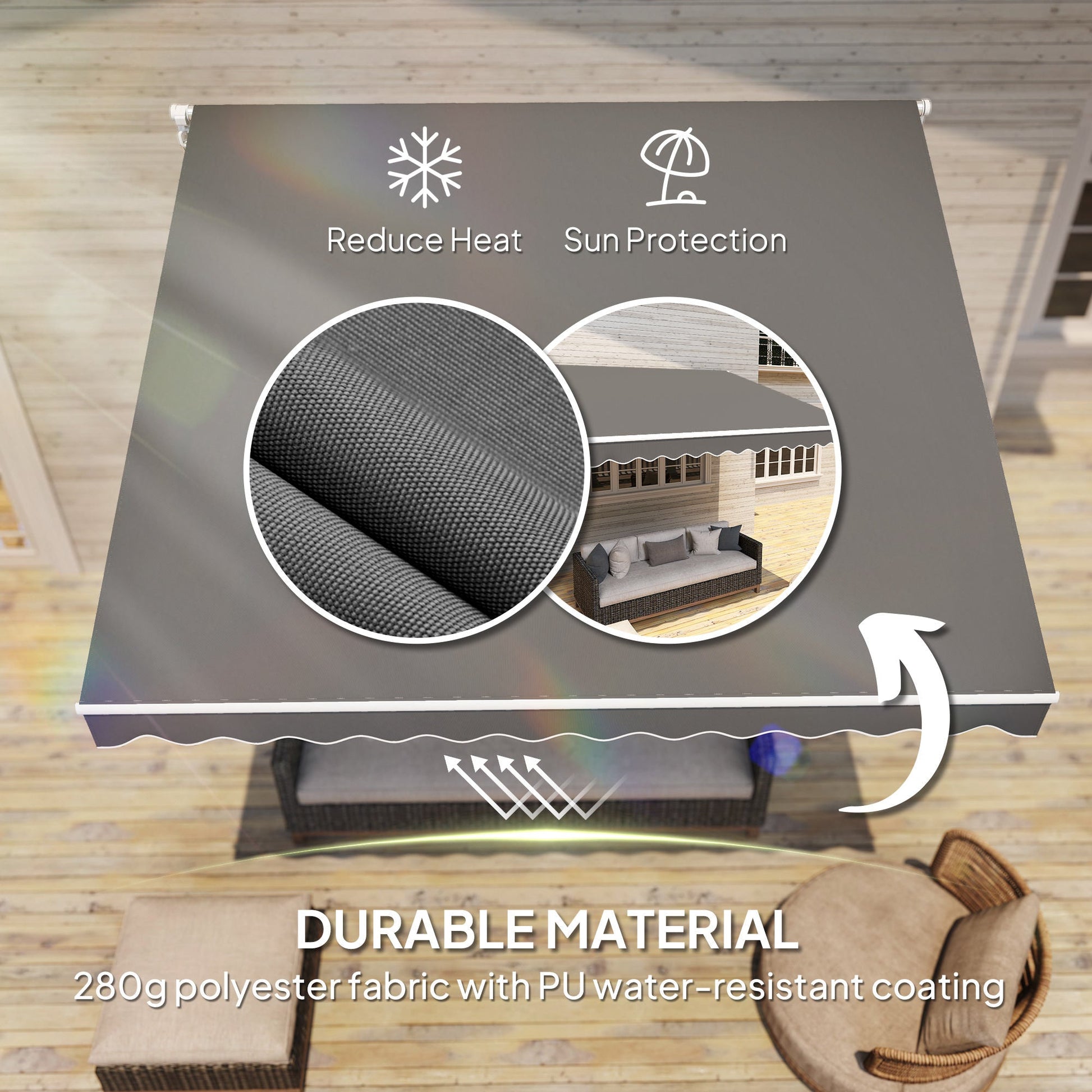 Featuring a thick sun-shielding canopy on an aluminium frame, this 2.95 x 2.5m garden awning from Outsunny provides sufficient shade for the season. Its manual design allows flexible setup above doors or windows and it easily mounts onto your preferred surface with all accessories included. Finished with a crank handle for easy operation, this patio canopy is great for enjoying the outdoors like never before.