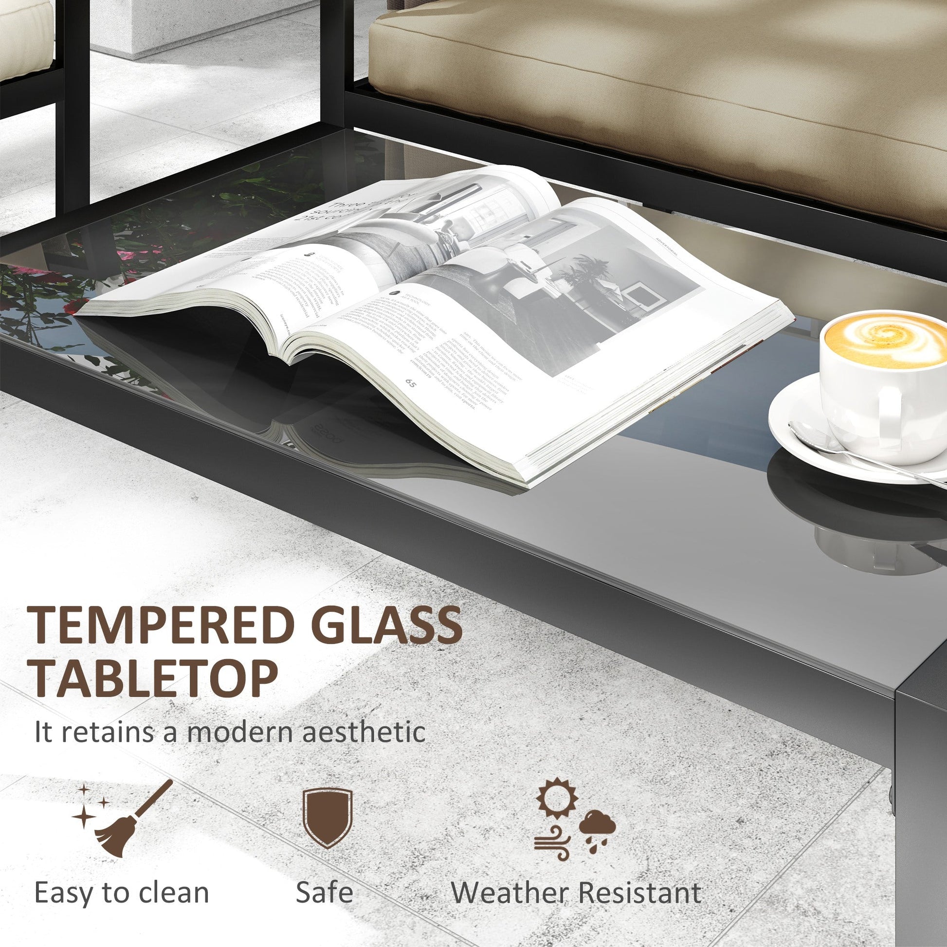 Let friends and family gather in a simple yet sleek style outdoors, thanks to this Outsunny set. Four pieces – two armchairs, a two-seater sofa and a coffee table - seats up to four people. Each frame is made from steel: strong and supportive. Thick padded cushions on the seats and backs for comfort. Comes complete with a tempered glass-top table.
