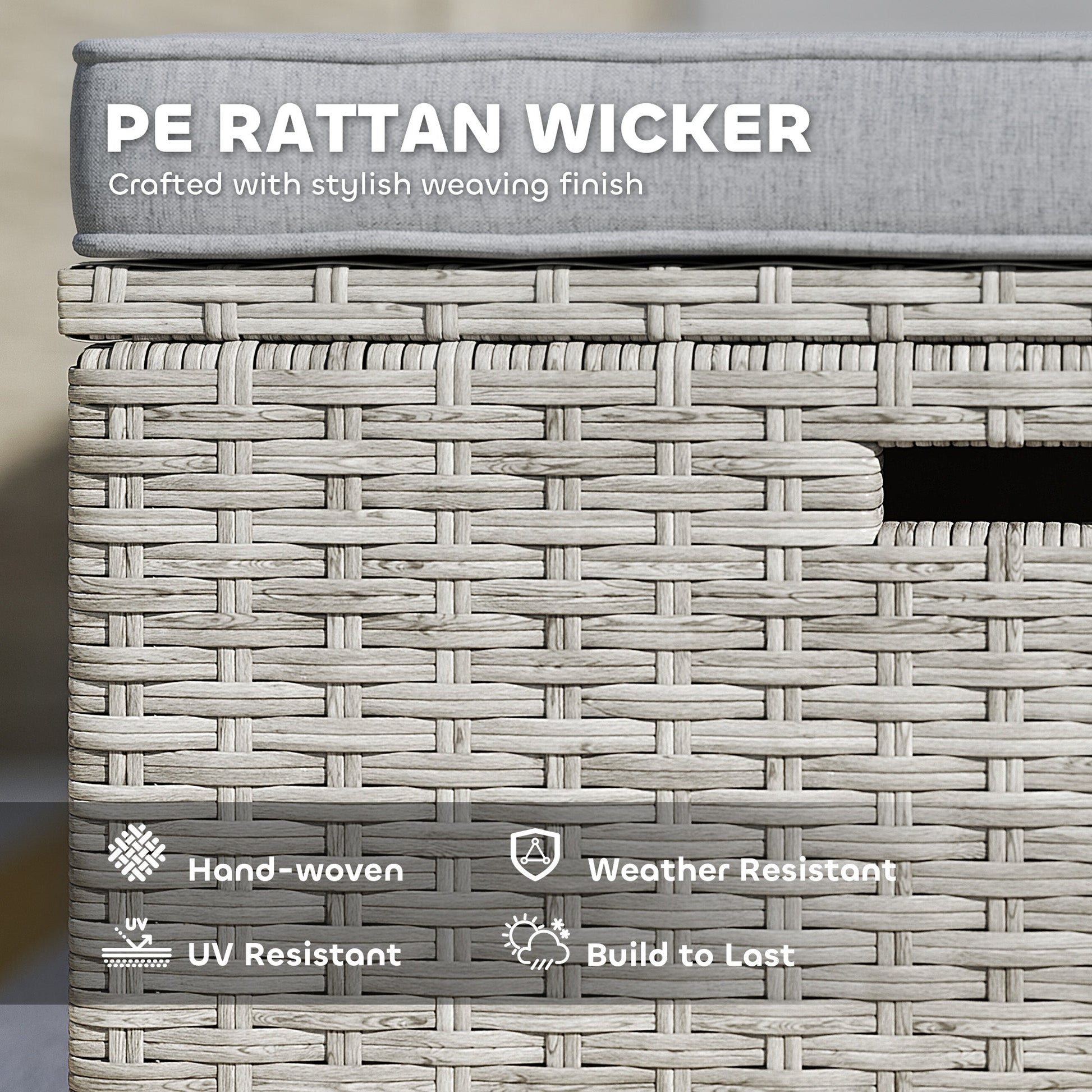 An inviting outside, all day long with this Outsunny garden rattan furniture set, including two single-arm chairs, two footstools and a matching table - set up how you want for morning coffee or lounging. Steel frames mean a strong core wrapped in protective plastic rattan. The outdoor rattan furniture set complete with seat and back cushions for plenty of comfort. A functional table with storage keeps essentials close at hand, topped with wood grain slats, adding a practical and stylish touch.