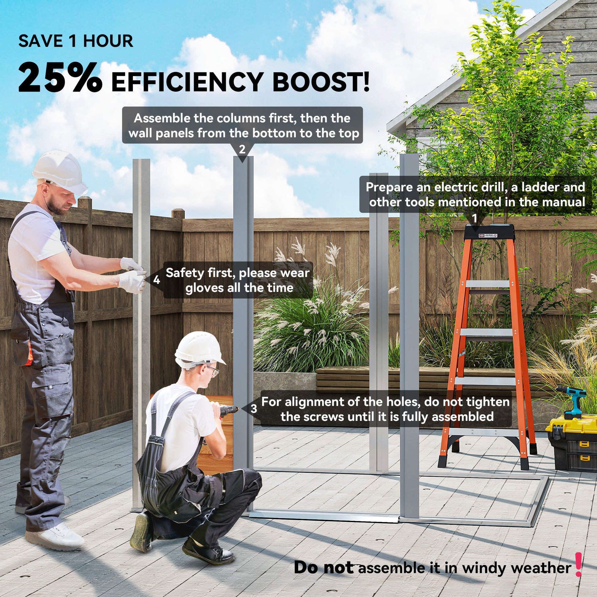 - Note: Three people required for installation in approx. four hours - ALWAYS wear gloves. Do not build during windy weather conditions.