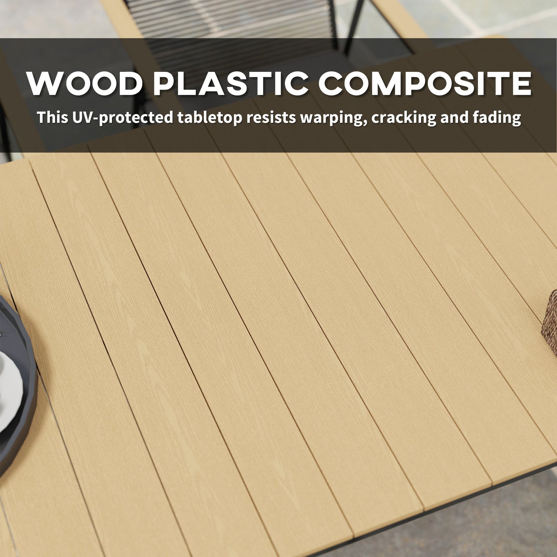 Transform your outdoor space with this stylish Outsunny 6 seater garden table and chairs! Each chair is equipped with a comfy padded cushion for hours of relaxation, while the wood plastic composite tabletop resists weather damage, ensuring durability. Suit for al fresco dining, it combines comfort, practicality and modern elegance, making every meal an unforgettable outdoor experience.