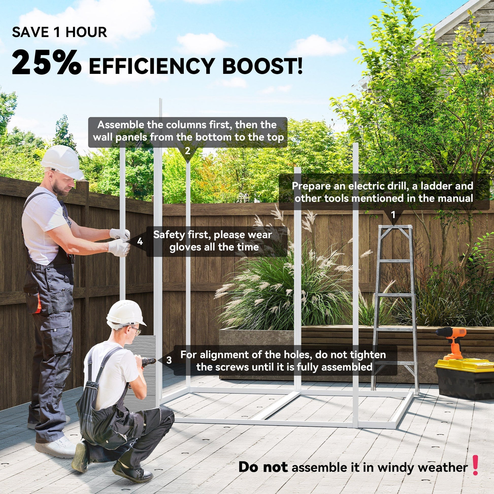 - Installation requires 2-3 people, includes protective gloves