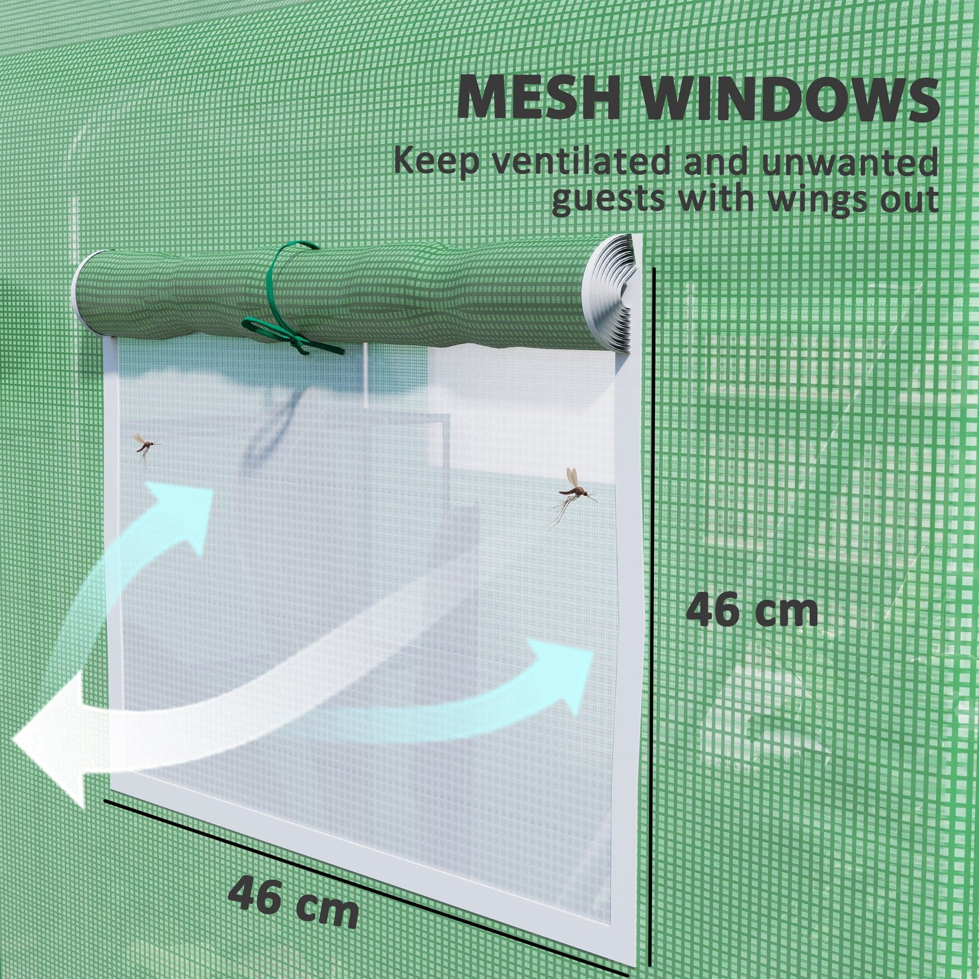 يمكنك زراعة النباتات على مدار العام مع مساحة كبيرة وحماية كبيرة، مع هذه الدفيئة البلاستيكية من Outsunny. تتيح الأبواب الثلاثة القابلة للطي والنوافذ الشبكية المتعددة الوصول بسهولة والكثير من الهواء النقي. مزودة بغطاء بلاستيكي 140 جرامًا للمتر المربع لغطاء واقٍ - يحمي الداخل من الطقس الخفيف ويسمح لأشعة الشمس بالمرور من أجل نمو جميل. مكتمل بأربعة أوتاد أرضية وأربعة حبال تثبيت في العبوة لتثبيت الدفيئة على الأرض.