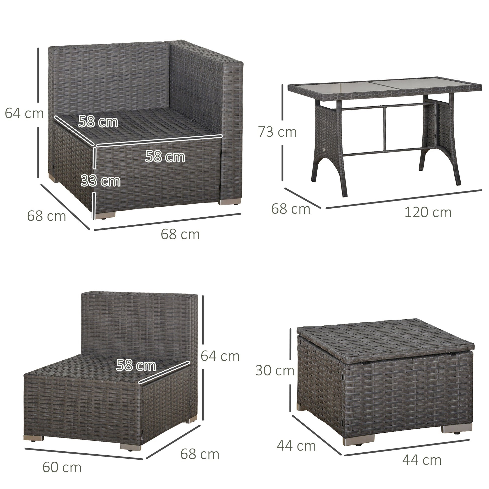 - Include: 3 x corner sofa, 3 x armless sofa, 3 x footrest, 1 x table, 7 x seat cushion, 7 x back cushion, 3 x footrest cushion, 4 x throw pillow