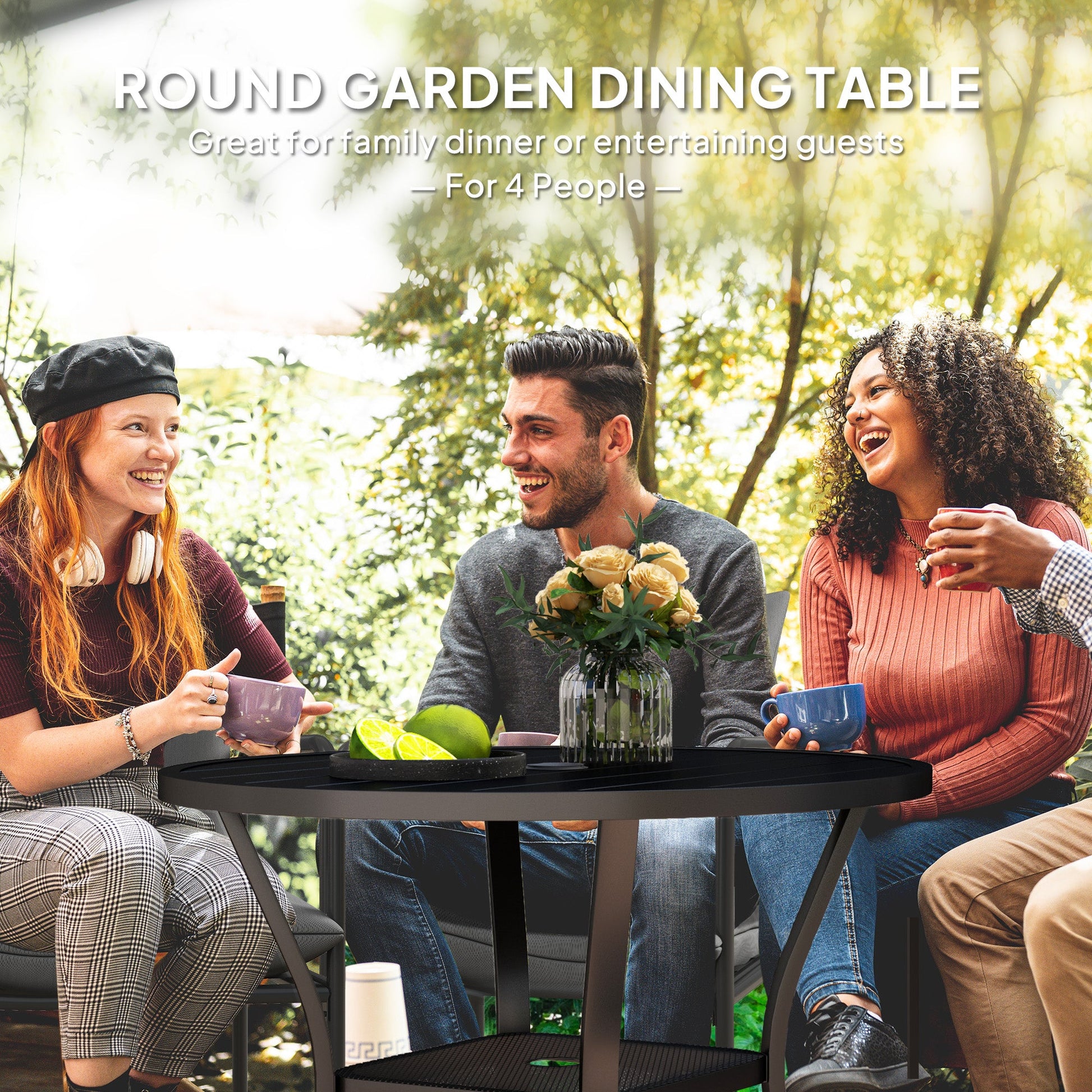 Outsunny 90 cm Garden Dining Table with 4-5 cm Parasol Hole, Round Outdoor Dining Table, Steel Garden Table with Slatted Metal Top and Wire Shelf for Balcony, Porch, Black