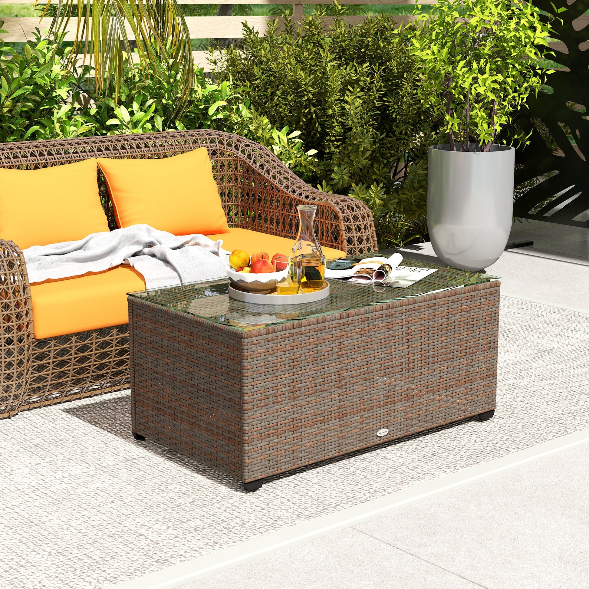 Forever style for your garden with this Outsunny rattan garden table. A galvanised steel frame with powder coating for a strong core structure; wrapped in tough plastic rattan, the garden side table effortlessly matches your current rattan garden furniture. It's fitted with a 5mm thick tempered top for a sleek touch and a safe holding place. Complete with adjustable feet for stability.
