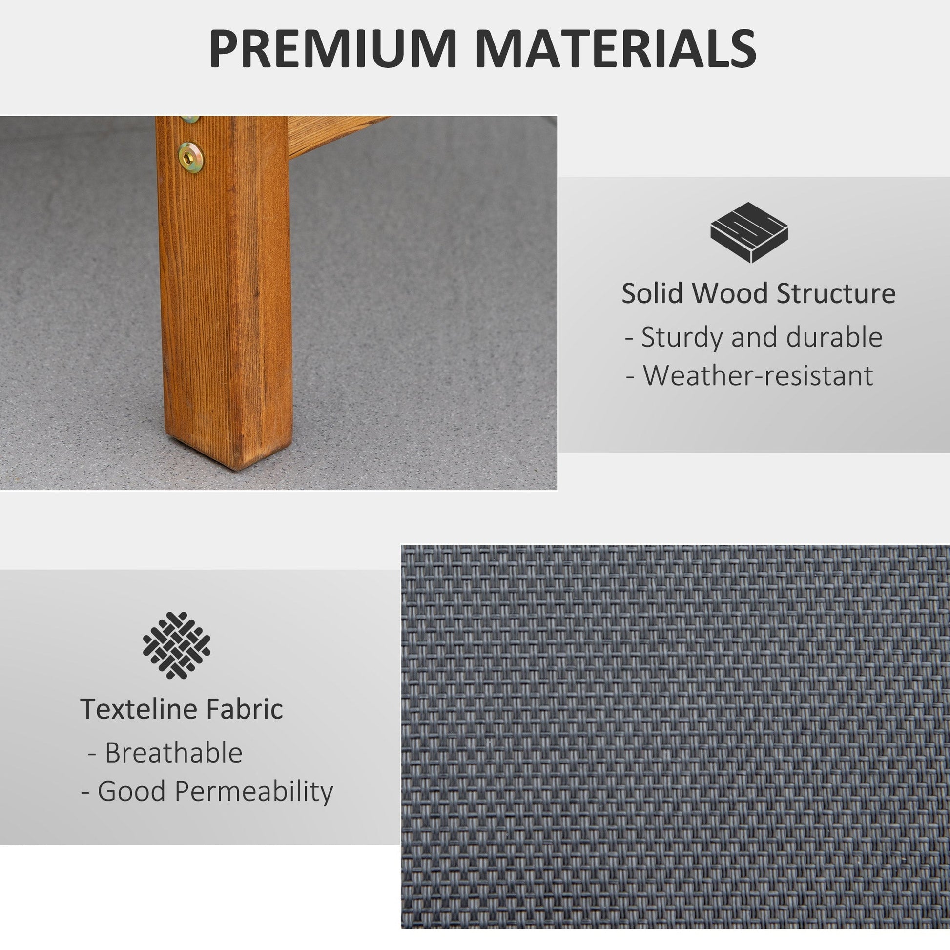 Outdoor lounging just got a lot better. Pair your days outside with this Outsunny lounger for complete relaxation. Using solid wood to form the frame, it is able to handle up to 120Â kg effortlessly, with a three-level adjustable back for in-control supports crafted into a smooth curved shape that better adapts to your body shape. It's fitted with a breathable mesh fabric seat that holds your body in place, with a removable pillow for extra comfort and support to the head and neck.