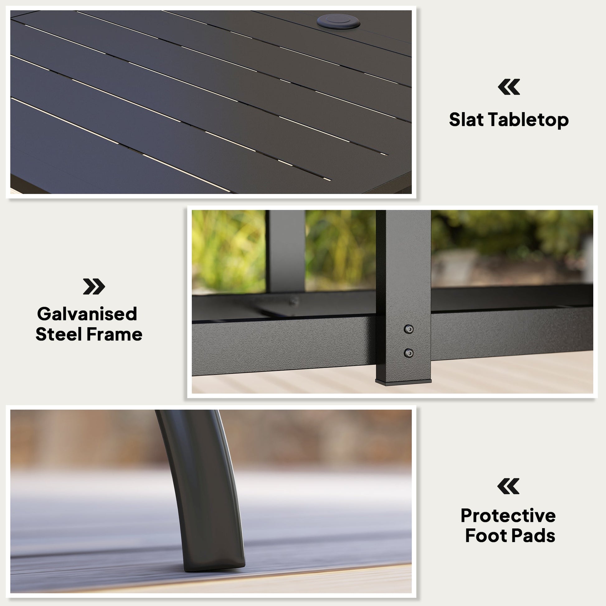 This Outsunny outdoor dining table is made from galvanised steel, with a powder coating - it's a strong and durable piece suitable for your garden. The outside table features a ⌀42mm hole in the middle to hold a parasol securely - keep shaded as you sit. Made from galvanised steel, with a powder coating, outdoor coffee table is a strong and durable piece suitable for extended use.