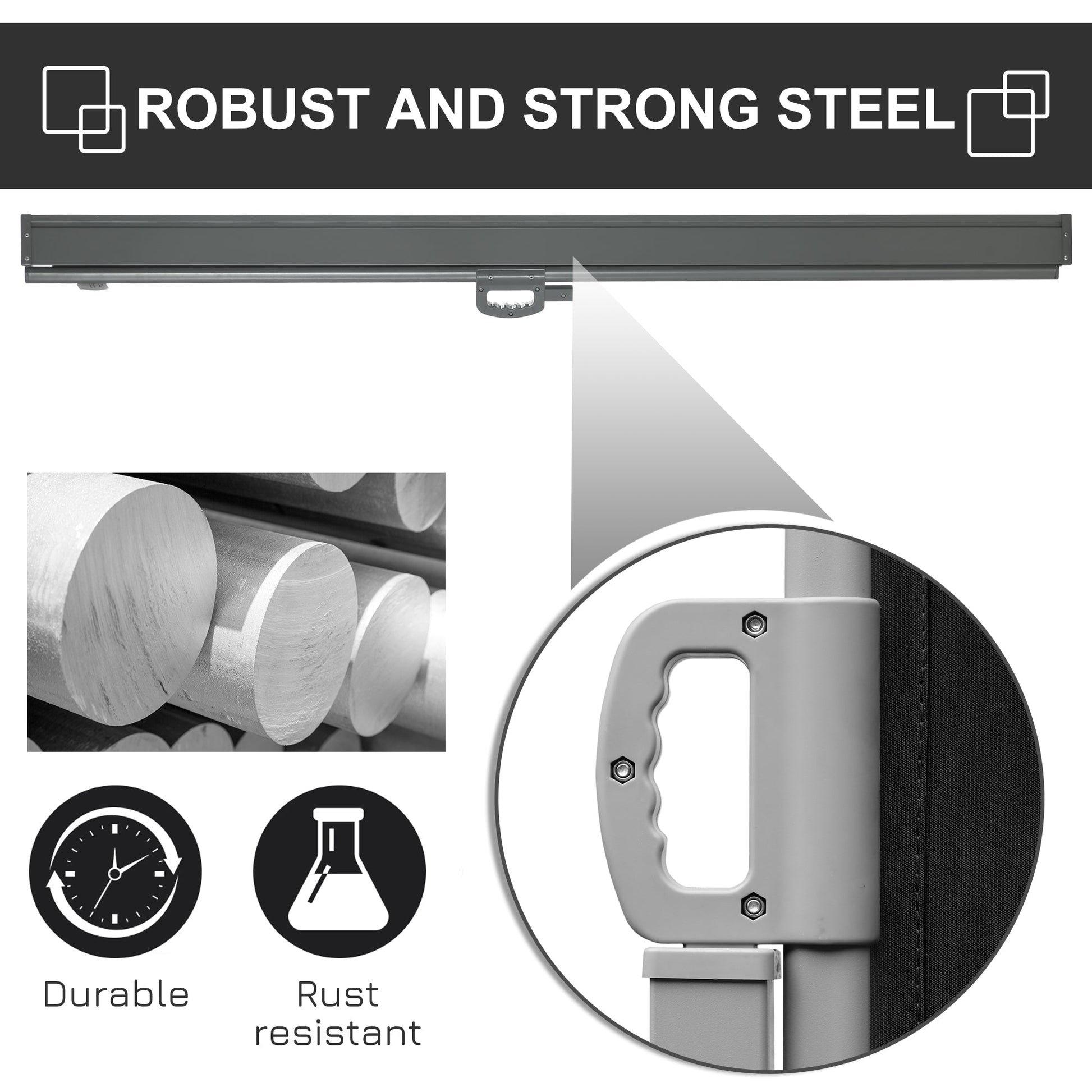- Easy to use and set up: simply position and fix the two steel frames to cement/solid wood, where the canopy will extend and fix from a steel post to the other securely