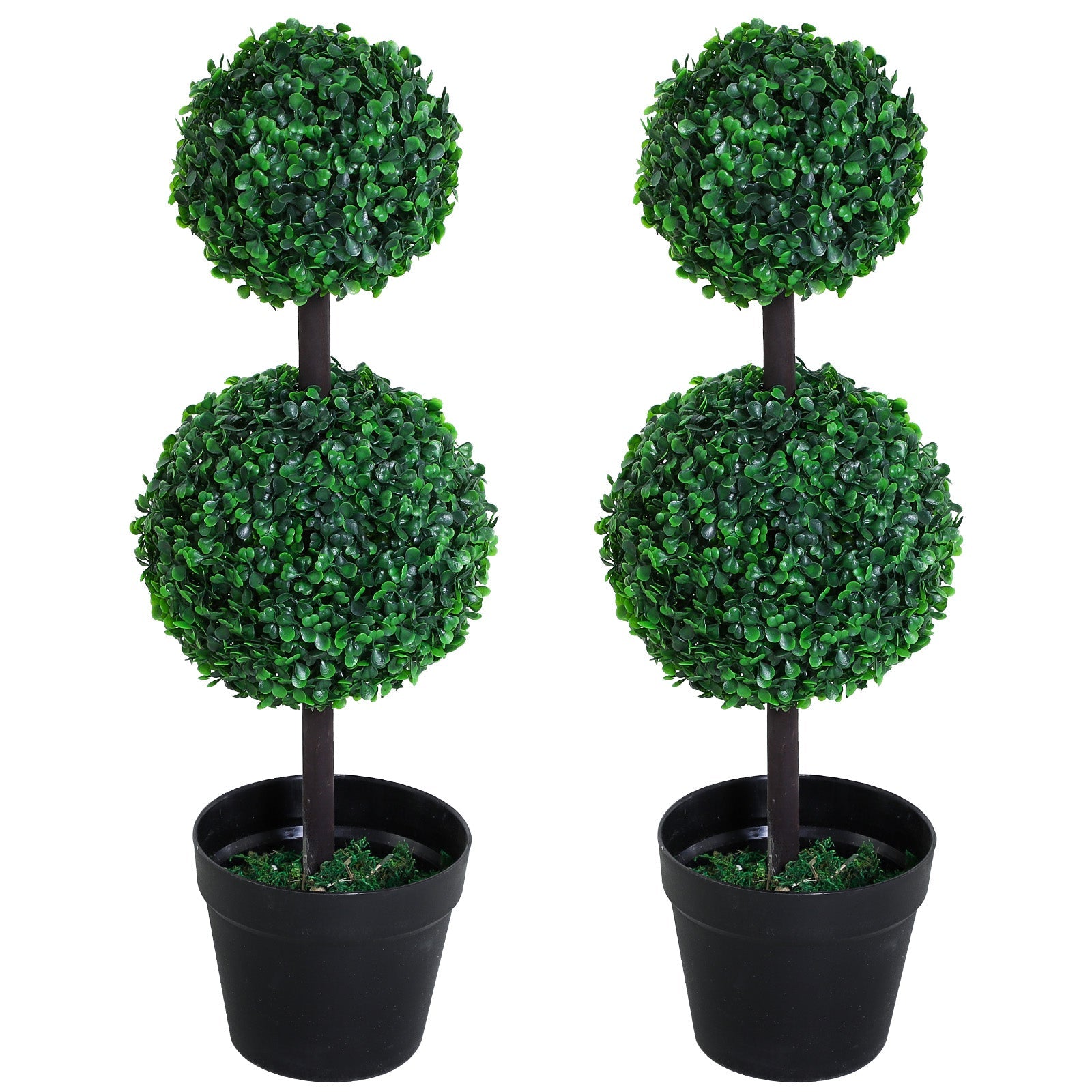 Breathe a new lease of life into your home with this potted plant from Outsunny. Sold in a set of two, each faux plant is presented in a tall, double ball design for a unique and stand-out design that instantly brightens up your surroundings. Filled with cement each black pot keeps the fake tree upright, with it delivered fully assembled to allow you to place the plastic plant where you want straight away. The easy way to inject greenery into your home with no upkeep required.