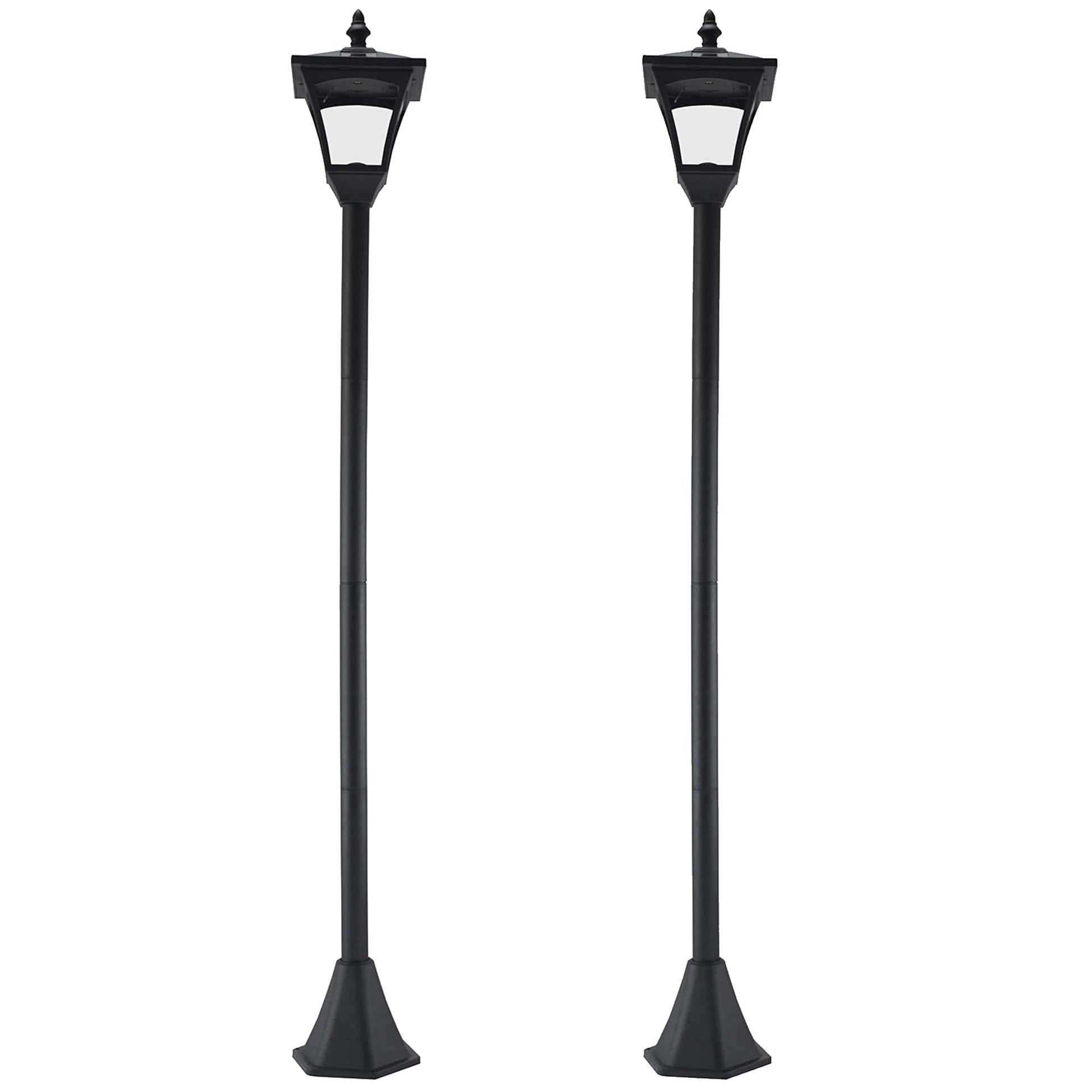 The stylish set of 2 outdoor solar lamp post from Outsunny features removable LED light and automatic light sensor for convenient lighting in dark. 4 pieces of a-Si solar panels on the top, the energy-saving solar panel lamp post can light up to 5-6 hours when fully charged. The water-resistant materials and the chic style make the solar light an excellent addition to your gardens, pathways, patios, decks, poolside and more.