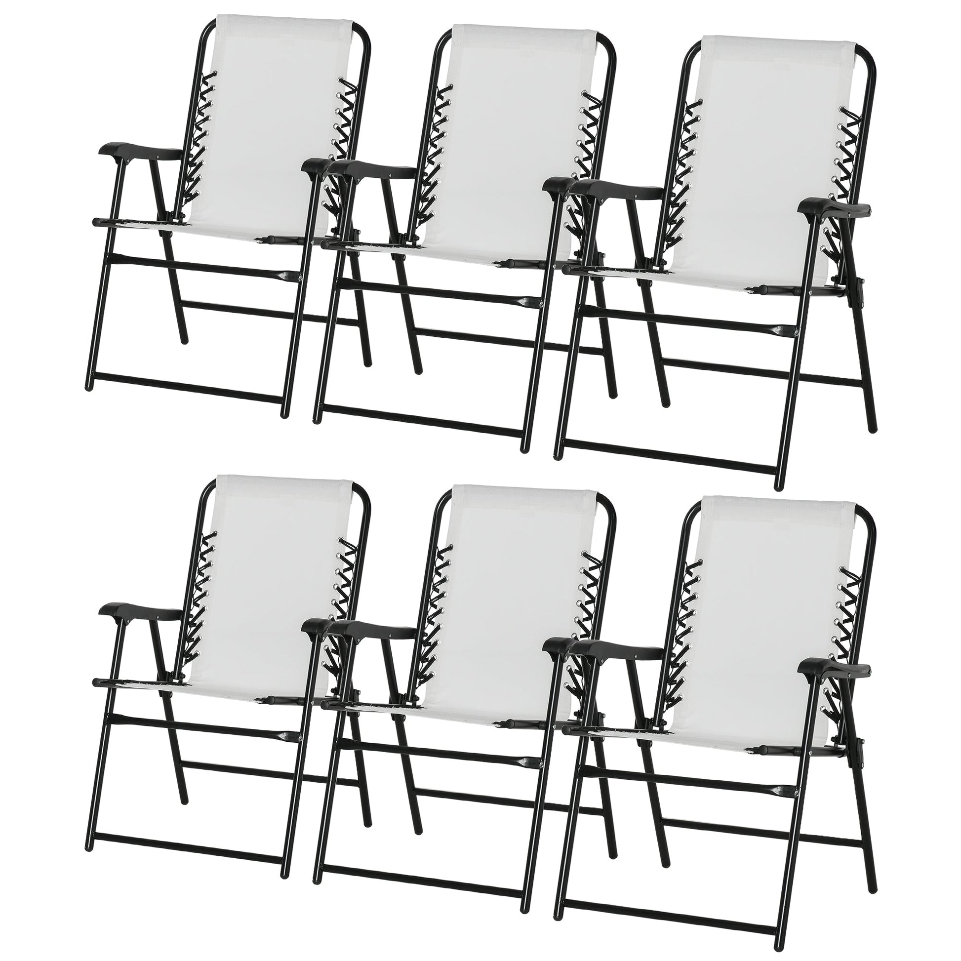 مجموعة الكراسي الخارجية القابلة للطي المكونة من ست قطع من Outsunny رائعة لأي تجمع، سواء في الداخل أو الخارج. إطارات كراسي الحديقة مصنوعة من الفولاذ المطلي بالمسحوق لهيكل قوي وداعم. مقعد من القماش الشبكي يحمل جسمك بشكل مريح، والظهر المرتفع ومساند الذراعين توفر لك الدعم. خفيفة الوزن وقابلة للطي، كل كرسي سهل الحمل والتخزين. لا تضيع الوقت في التجميع؛ اجلس واسترخ!