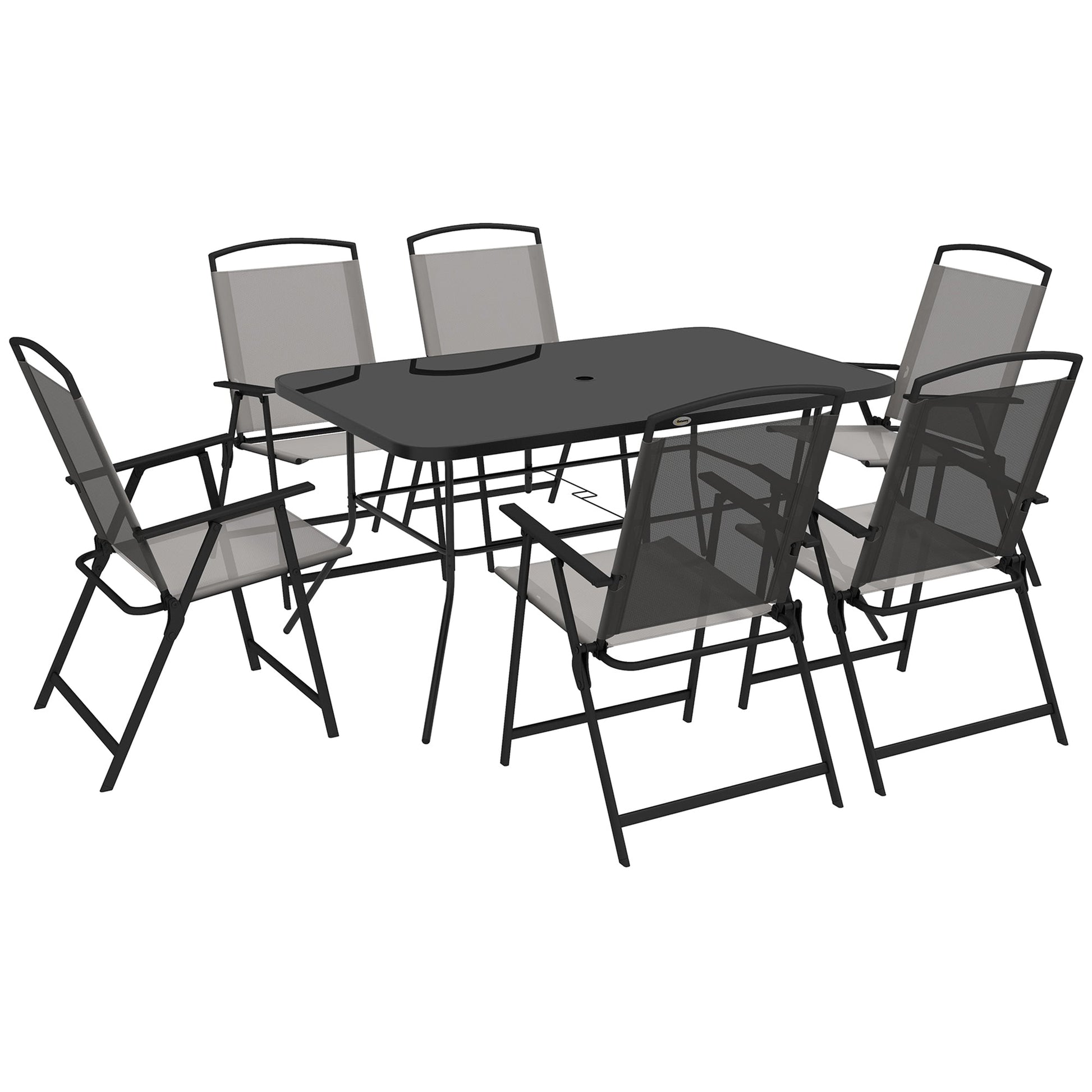 طقم طعام للحديقة مكون من سبع قطع من Outsunny، مع طاولة ذات سطح زجاجي وكراسي قابلة للطي - رمادي