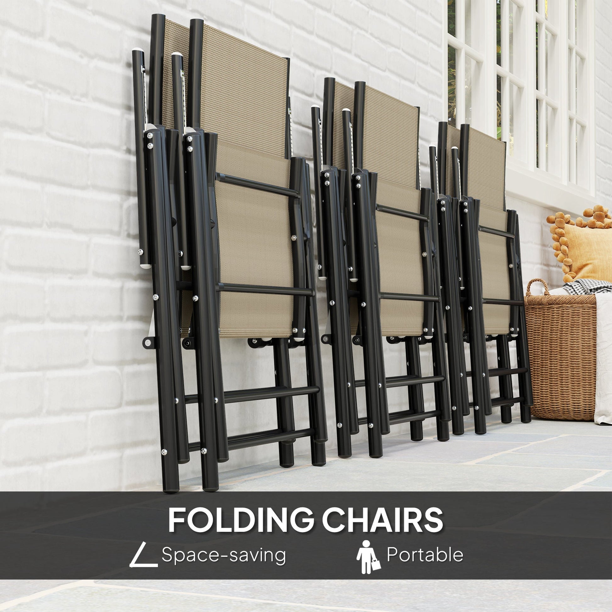 Simple, stylish outdoor dining with this Outsunny outdoor dining table and chairs set. It comes with a rectangular dining table and six matching folding chairs: plenty of room for you and company. The powder coated galvanised steel frames mean the patio table and chairs are strong. The folding chairs save space and come with breathable texteline seats for comfort. This outdoor garden furniture set is complete with â50mm hole in the table to hold a parasol umbrella in place.