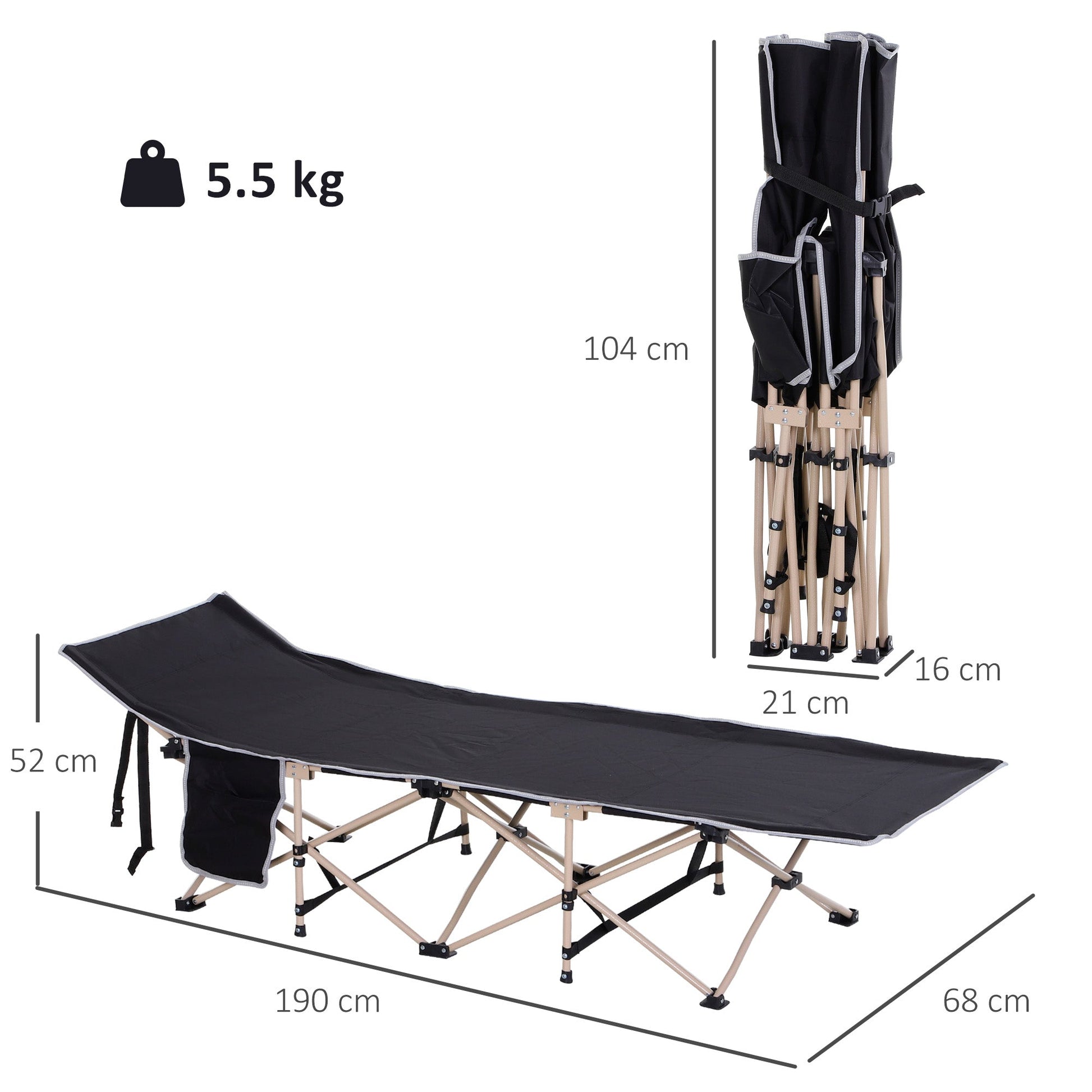 Never let your camping trips and festivals leave you uncomfortable after a night's sleep, with this Outsunny cot bed. A strong powder coated steel frame, with cross-over legs for balance and support; fitted with a 600D Oxford cloth bed. The plastic top layer ensures extra durability and resistance to water and liquids. A folding design to carry with ease. Carry bag included.