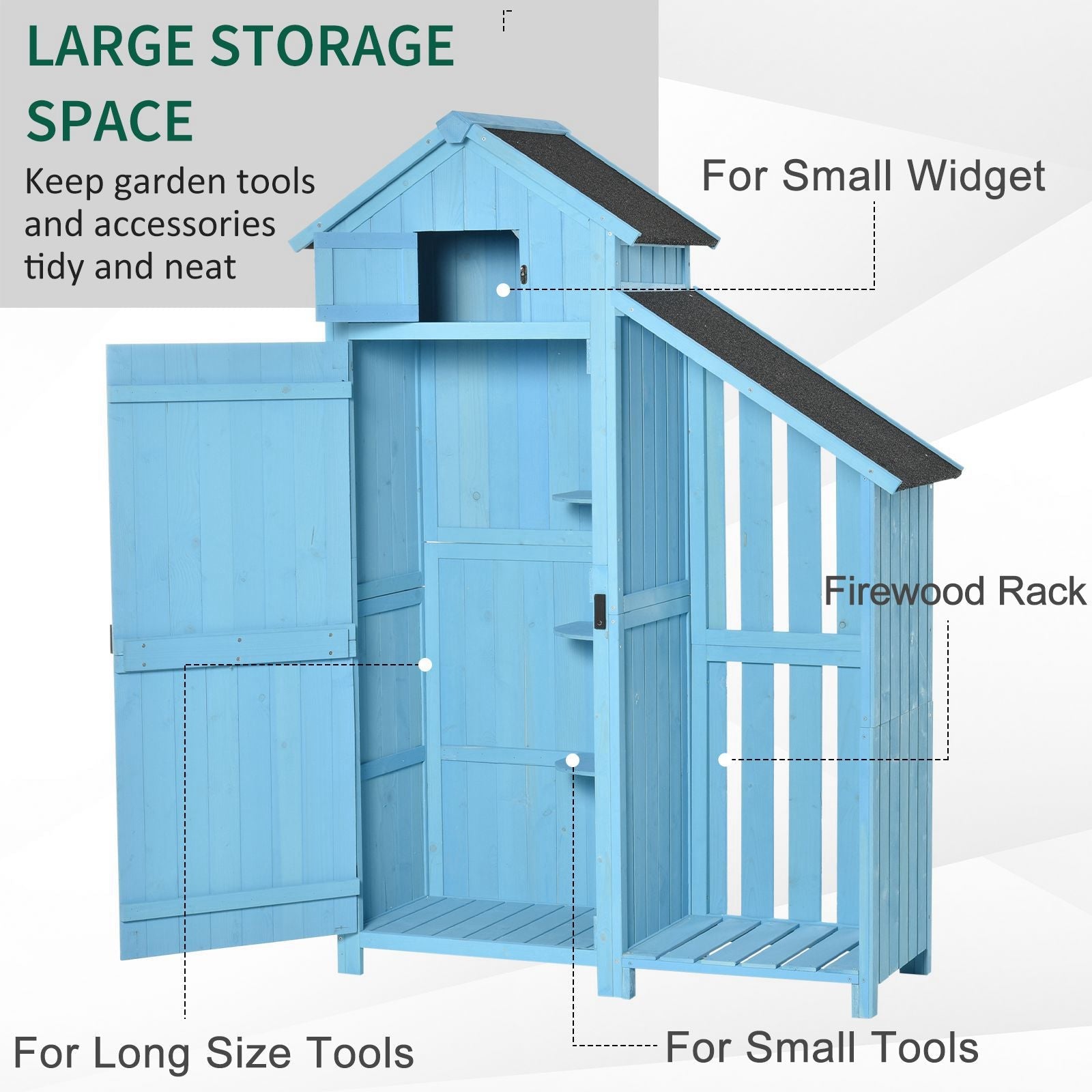 Reclaim garden space with this tall and narrow small shed from Outsunny. Made from fir wood, this tool shed is covered with a coat of protective paint, which helps protect the structure from light to mild weather damage for extra wear. The open right side is perfect for firewood. A sloped roof prevents water build-up, with asphalt covering so liquid doesn't seep through. It's finished with a lockable door making it secure. A handy piece suitable for all outdoor spaces.