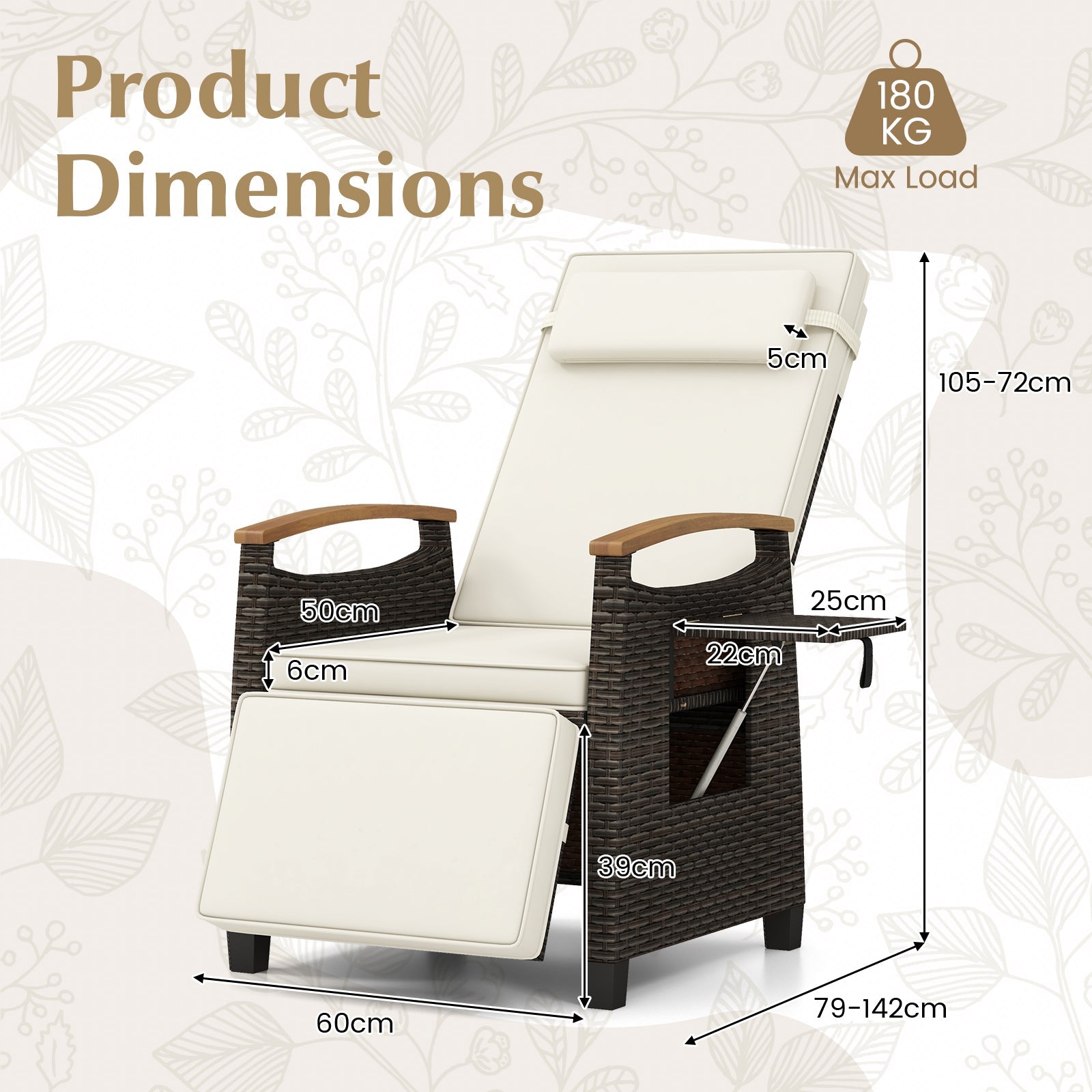 Patio Rattan Lounge Chair Recliner with Adjustable Footrest and Side Table-Off White