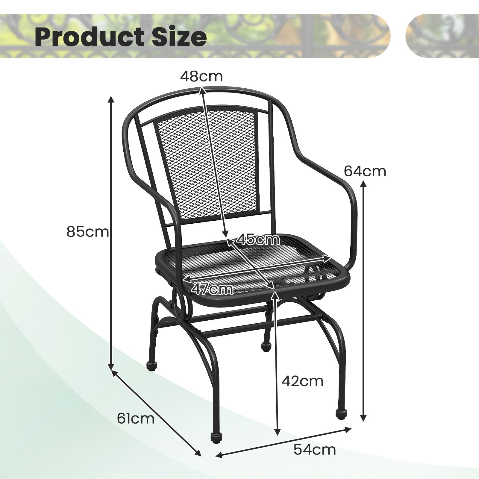 Color: Black Material: Metal Product Size: 61 x 54 x 85 cm (L x W x H) Backrest Length: 48 cm Armrest Height: 64 cm Seat Height: 42 cm Seat Size: 47 x 45 cm(L x W) Weight Capacity of Each Chair: 102 kg Net Weight of 2 Chairs: 15 kg Box QTY: 1(May vary by batch) Package Includes: 2 x Patio Rocking Chairs 1 x User Manual