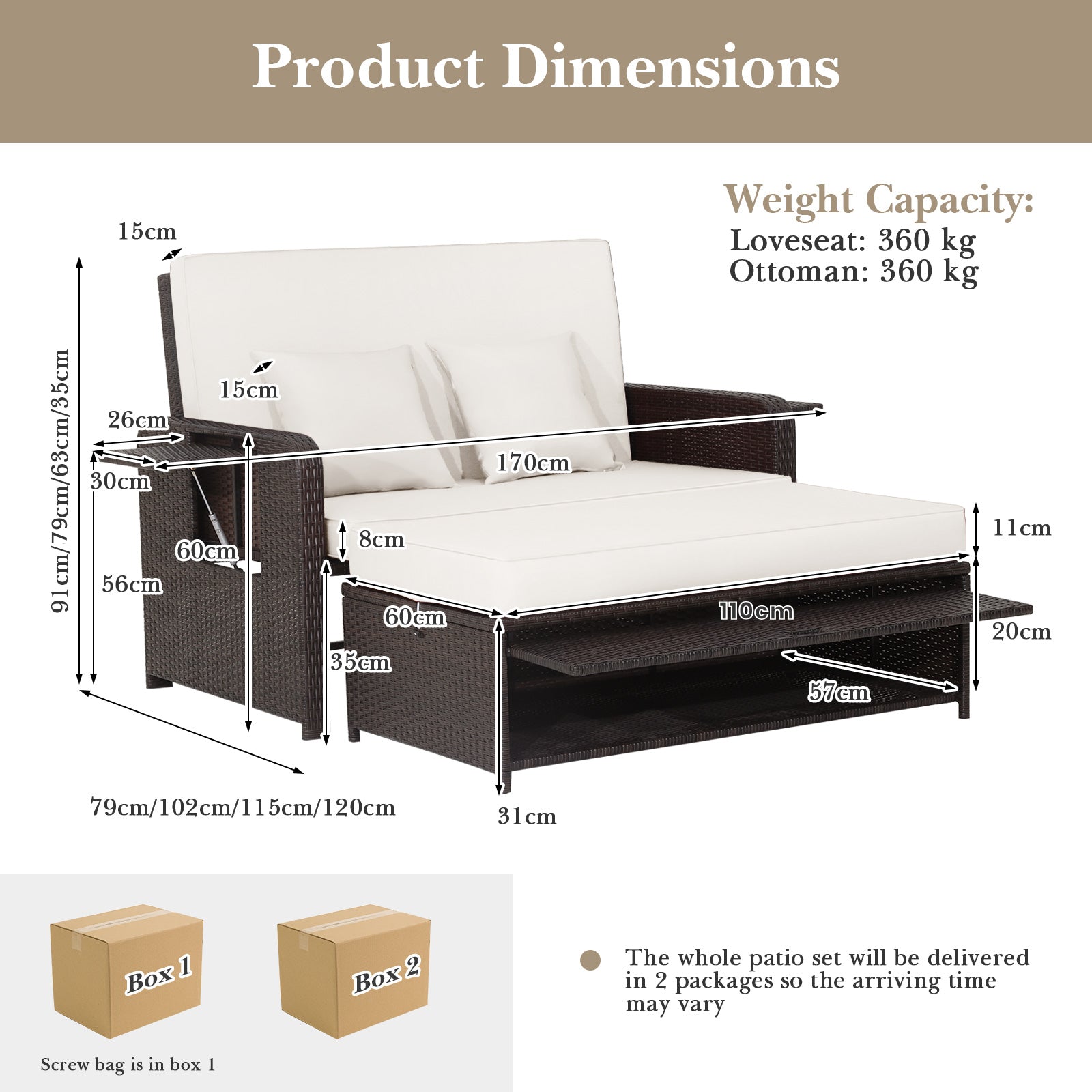 Colour of PE Rattan: Mix Brown Colour of Cushion: Beige/White Material: PE Rattan, Metal, Polyester, Sponge Dimension of Loveseat: 79/102/115/120 x 170 x 91/81/63/35 cm (L x W x H) Dimension of Ottoman:110 x 60 x 31 cm (L x W x H) Dimension of seat cushion:110 x 60 x 8 cm (L x W x Thickness) Dimension of back cushion:110 x 60 x 15 cm (L x W x Thickness) Dimension of ottoman Cushion:110 x 56 x 11 cm (L x W x Thickness) Dimension of pillow:40 x 40 x 15 cm (L x W x H) Seat height of loveseat:35 cm Net weight of loveseat:20 kg Net weight of ottoman:11 kg Weight capacity of loveseat:360 kg Weight capacity of ottoman:360 kg Box Qty: 2 (May vary by batch) Package includes: 1 x Loveseat 1 x Ottoman 1 x Seat cushion 1 x Back cushion 1 x Ottoman cushion 2 x Pillows 1 x Instruction manual