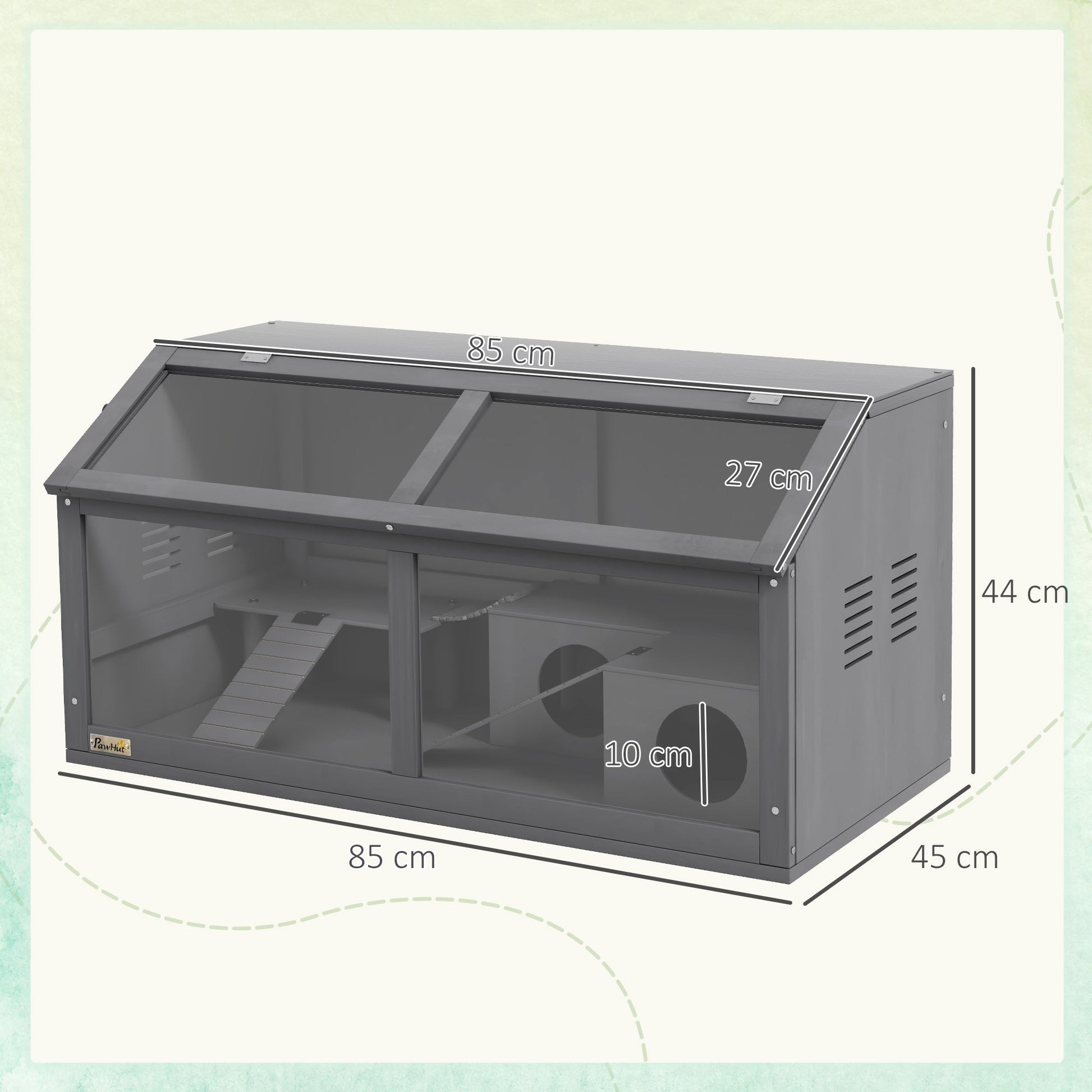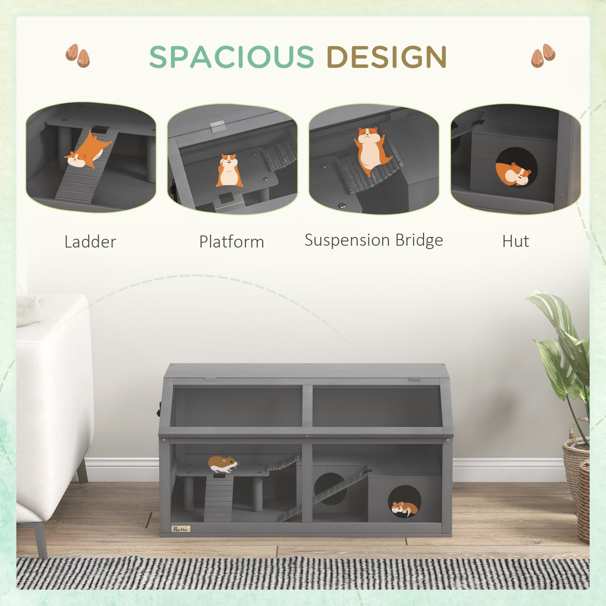 PawHut Hamster Cage, Wooden Small Animal Cage for Gerbils, Mice w/ Suspension Bridge, Openable Top, Hut, 85 x 45 x 44cm - Grey