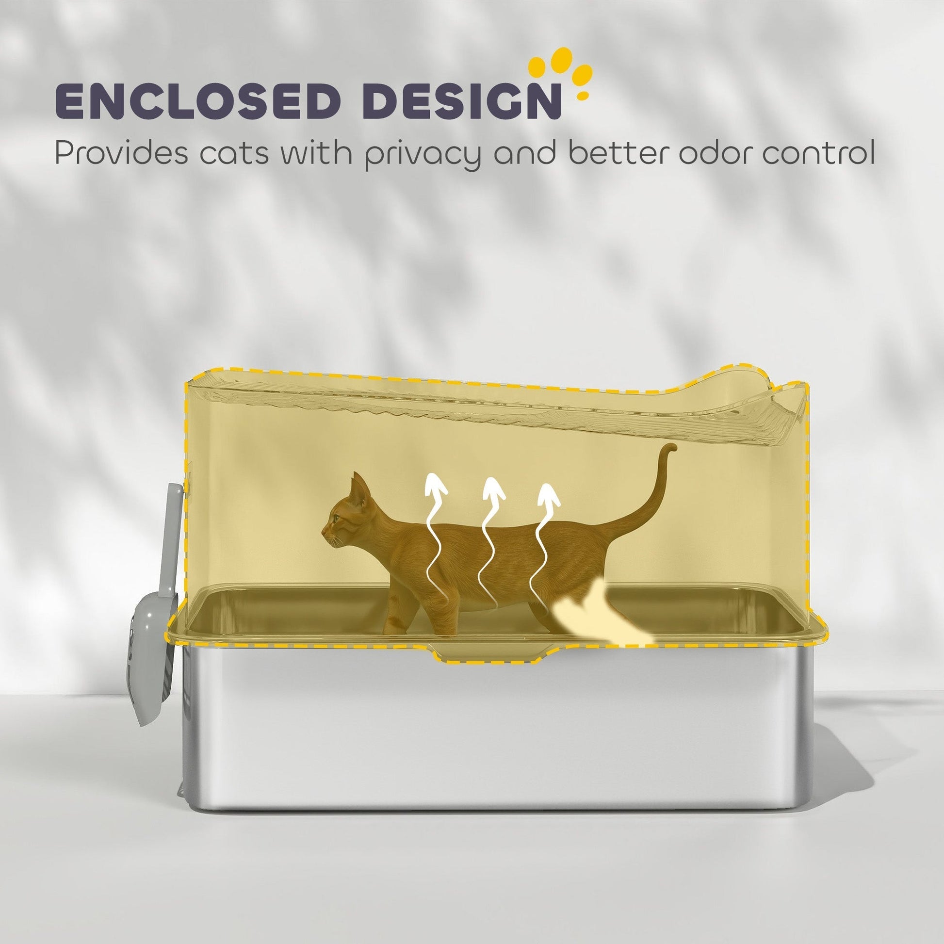 Discover the effortless cleaning of the PawHut stainless steel cat litter box. With its solid stainless steel tray and handy scoop, keeping it clean is a doddle, ensuring your cat's paws remain clean. Enjoy a fresher home, thanks to the smart top entrance and enclosed design that effectively prevent leaks and controls odours. Great for larger feline companions up to 9 kg, this spacious cat toilet combines practicality with comfort, making both you and your kitty happy.