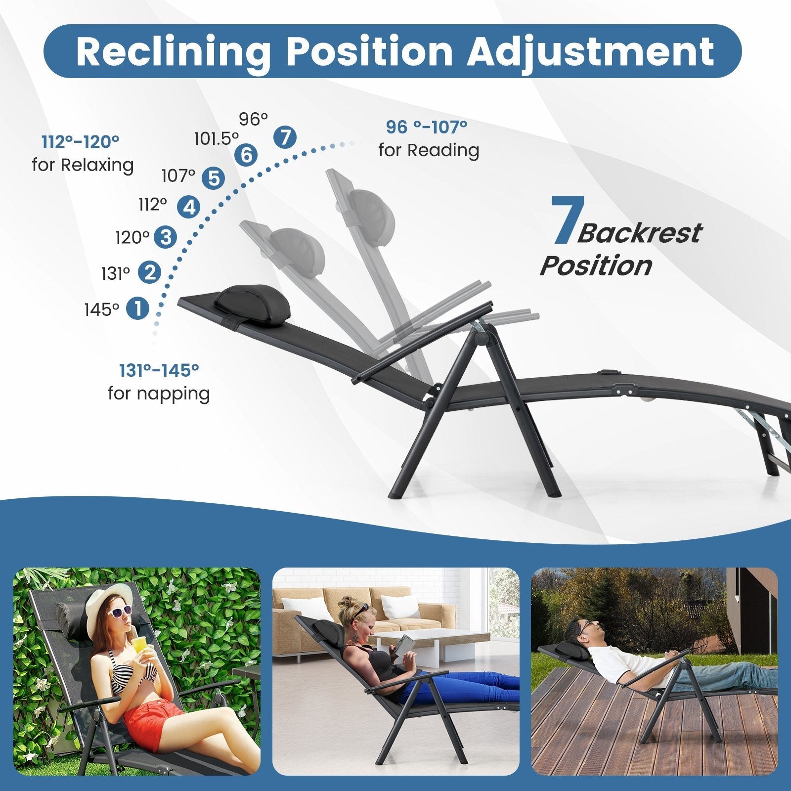 If you want to have a nice outdoor leisure time, then our folding lounge chair is defiantly worth your attention! Adapting the comfortable design, our chaise chair features breathable backrest and soft head pillow for a cozy rest, and you can even adjust the backrest from 7 positions to suit your relaxing need whether it is reading or napping. Apart from that, the metal frame promise a long service life, it can hold up to 150 kg of weight which is enough for you to lie on it. Additionally, the simple folding structure allows you to store it in cabinet or back of your car for storage or transportation. Our lounge chair is your perfect choice for various outdoor occasions. 7 Backrest Position: More than just a chaise lounge chair, this folding reclining chair is equipped with a backrest of 7 adjustable positions to meet your different relaxing needs. To be more specific,you can change reclining position from 96° to 145° for reading, relaxing or napping. Designed for Comfort: Designed for a better sitting experience, this chaise lounge chair is made of breathable fabric which features easy cleaning and a snug fit. In addition, equipped with soft headrest and rounded handrail, this ergonomic designed lounge chair can reduce the stress on your muscles. Sturdy Frame: Build from high quality metal pipe, this chaise lounge chair features long service life, with the load capacity of 150 kg. Apart from that, fitted with non-slip feet for added stability, you can lie back and relax on it without any concern. Easy Folding for Storage: Designed with an easy folding function, this reclining chair can be fold down to a compact size to fit in a in a cabinet or trunk. With the light weight of only 8 kg, the lounge chair can be easily carried for transport. No Assembly Required: The reclining chair comes pre-assembled, which will save you the trouble and time of installing. You can start enjoy your outdoor leisure time once you take this chaise chair out of the box.