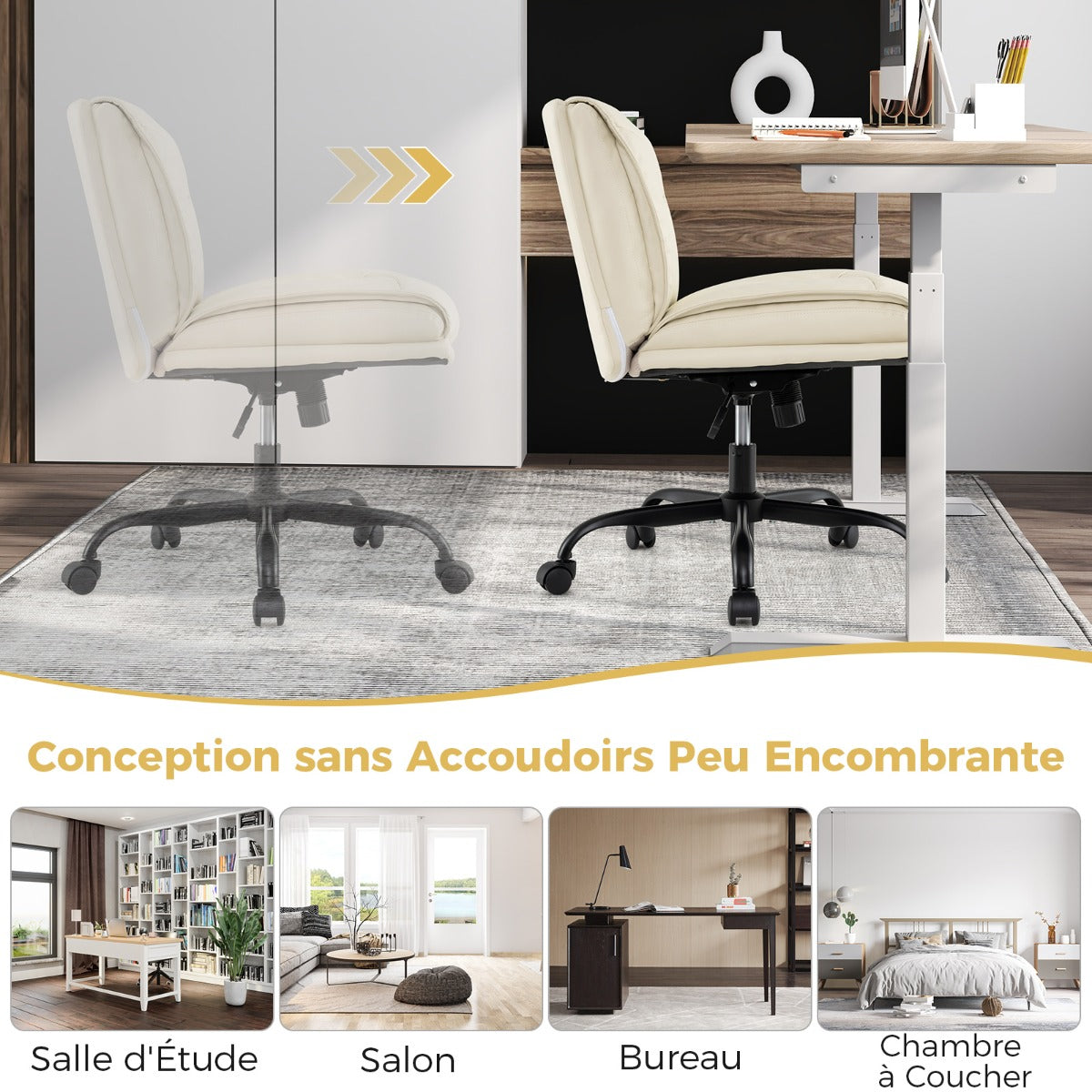 Whether you're furnishing a home office, updating your vanity area, or in need of a comfortable desk chair, this multifunctional chair will beaperfect option.The seat is height-adjustable to match desks of different heights.More importantly, the 99°-112° rocking backrestand 62 cm(W) x 47 cm(D) large seat allow you to lean on our chair to fully reduce your fatigue. The skin-friendly PU leather cover and elastic sponge enable you to sit with comfort. The desk chair also comes with 5 rolling wheels for easy movement. Adjustable Swivel Desk Chair:The home office chair features a 52-60 cmheight-adjustable seat and 99°-112°rocking back, providing you with the optimal sitting position. Plus, the360° swivel seatalso allows you to easily turn around to communicate with your friends. Comfortable Cross Legged Chair: The 60 cm wider backrest and 62 cm(W) x47 cm(D) spacious seat offer you cozy back and hip support. The cross-legged chair is an ideal option for reading magazines, watching TV, listening to music, or playing games. Premium PU Leather and Sponge:Upholstered in smooth PU leather, the desk chair ensures askin-friendly touch and easy maintenance. The high density sponge filling allows for great softness and high elasticity for upgraded sitting comfort. Space-saving Armless Design:When not in use, the armless desk chair can be slid to the table to save more space. Moreover, the 52-60 cmseat height makes it suitable for most kinds of tables. Stable Support and Easy Movement: The SGS certified gas lift and 5-claw baseensure sturdy support. The chair bears a weight of up to 150 kg. Additionally, 5 rolling castershelp you easily move it around. You can effortlessly move it from the study to the living room.