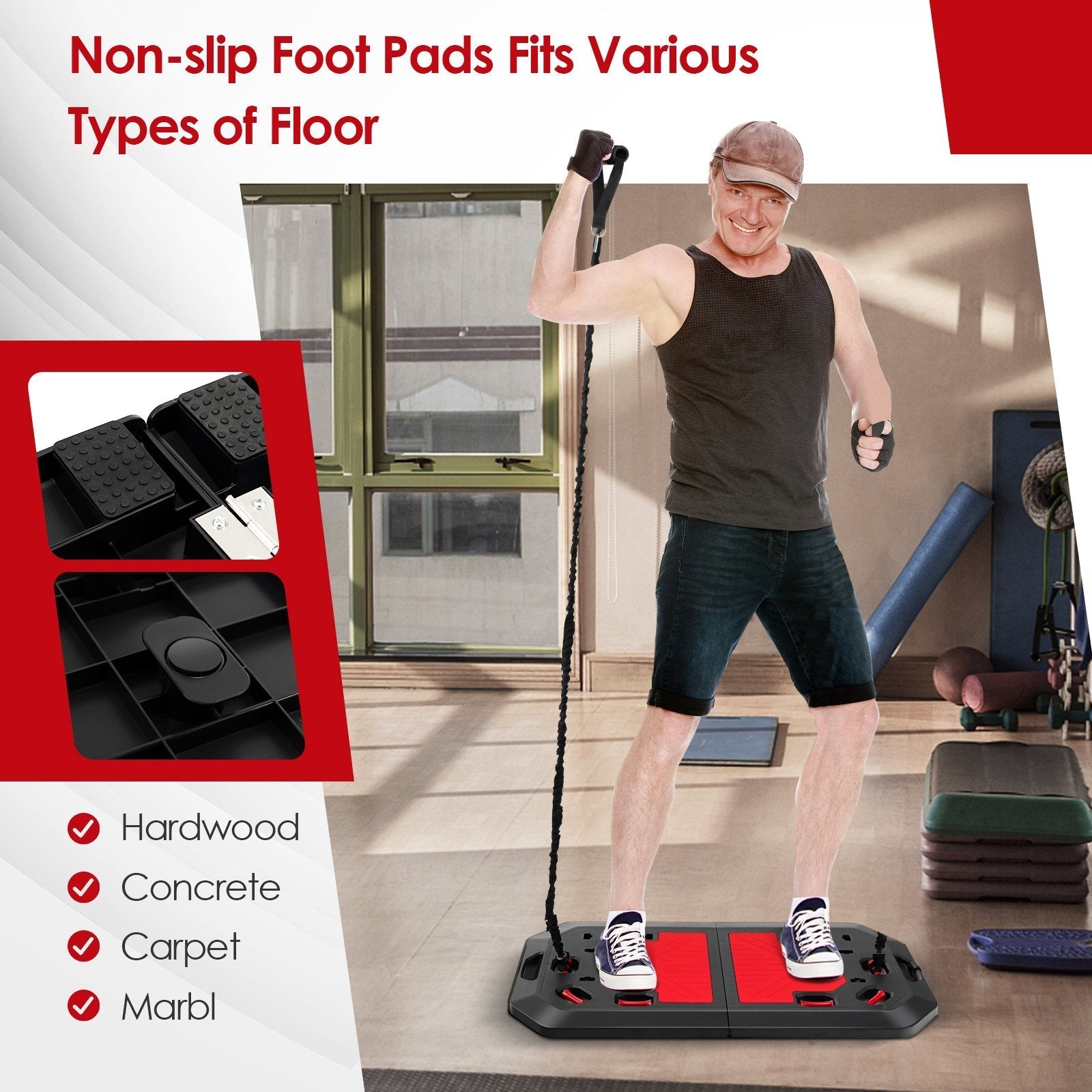 Colour: Black + Red Materials: ABS, EVA, Metal Dimension of Unfolding:86 x 50 cm (L x W x H) Dimension of Folding:50 x 4 x 43 cm (L x W x H) Size of Push Up Handgrips:16 x 8 cm (L x W x H) Total Net Weight:5 kg Weight Capacity:120 kg Box Qty:1(May vary by batch)Package Includes: 1 x Foldable Base Board 2 x Elastic Strings 2 x Handles 2 x Push up Handgrips 2 x Ankle Straps 1 x Pilate Bar 1 x Door Anchor 1 x Drawstring Bag 1 x Instruction Manual