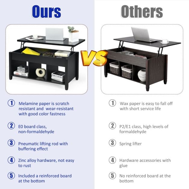With hydraulic lifters, raising and lowering the tabletop has never been smoother. Not only that, but with specially designed round bumpers, no more loud slamming noises. Elevating to 63cm off the ground, the coffee table can also serve as a work desk or a dining desk. The center table can create plenty of storage with the help of these parts: 1 105 x 52cm tabletop for a laptop and snacks, 1 93 x 45 x 15cm hidden compartment for books, 3 30 x 48 x 24cm open cubes for sundries and decorations. Strong side legs and middle legs will stabilize the whole frame and ensure high strength. With anti-slip foot pads, it’s safe to place the coffee table in the living room or reception room. If you are looking for a lift up coffee table like this, do not hesitate to place an order! Secured Lifting System: The coffee table boasts strong hydraulic lifters that achieve super smooth and easy operation. Plus, round bumpers included will further avoid the slam shut and dampen the closing noises by dispersing the impact. Great Storage Expert: Besides a wide top, the center table contains a hidden storage compartment as well, which neatly keeps often-used items, like blankets, toys, game devices, etc. Also, 3 open cubes are perfect for listing all your books in an organized way. Strong and Stable Frame: Perfect stability is gained from a sturdy frame that consists of 4 side legs and added middle rectangle legs. When the top is not lifted, the top load capacity reaches 95kg. By the way, anti-slip foot pads are offered to keep the floor away from scratches. Multifunctional Design: Hold the edge and pull it upward, the tabletop will be elevated to a proper height of 63cm. Then it’s no longer limited to being a coffee table, it can be used as a temporary work desk or a dining table as needed. Modern Style and Easy Maintenance: The coffee table presents a simple but modern design, which could be a perfect match for diverse home finishes. In addition, overall surface is burr-free, so the daily maintenance is also very easy.