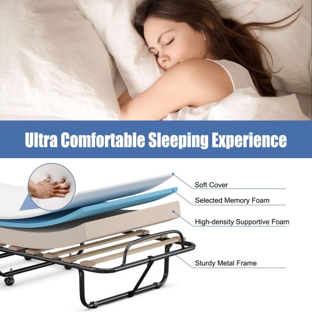 Rollaway Folding Bed with Memory Foam Mattress Guest Bed with Wheels-Beige