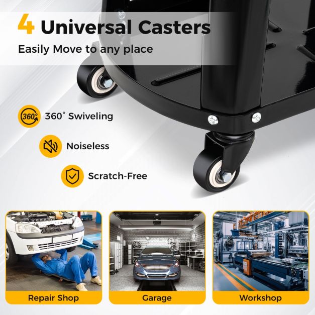 This mechanic stool features a sturdy metal frame that can support 300 lbs. It also features a divided tool tray and a tool holder that efficiently organizes and stores tools. The ergonomic curved seat, which doubles as a kneeling board when detached, provides premium comfort for long periods of work. The 360° rotating casters ensure effortless mobility on different surfaces. With its solid construction and versatility, it is a must-have for auto repair shops and garages. Attributes: 【Heavy Duty Metal Frame】This rolling stool is made of heavy duty metal, which is anti-deformation for maximum load of 300 lbs. In addition, the well-painted surface makes it wear-resistant for durable use. 【Perfect Tool Storage】Equipped with a divided tool tray and a tool holder, this rolling mechanic seat keeps all your essential tools within reach. Such a design will improve your efficiency and perfectly organize your workspace. 【Removable Curved Seat】The ergonomic and curved seat will provide superior comfort during long working hours. What's more, you can detach the seat and use it as a kneeling board. 【4 Universal Casters】This heavy duty stool has 4 smooth and universal casters that allow for smooth mobility on different floor types. 360 degree rotation allows easy access to tools and parts around your workspace. 【Various Suitable Occasions】Designed for versatility, this heavy duty rolling stool is a great choice for any repair shop, garage or DIY space. The mobility and functionality make it a must-have for mechanics and mechanical enthusiasts.