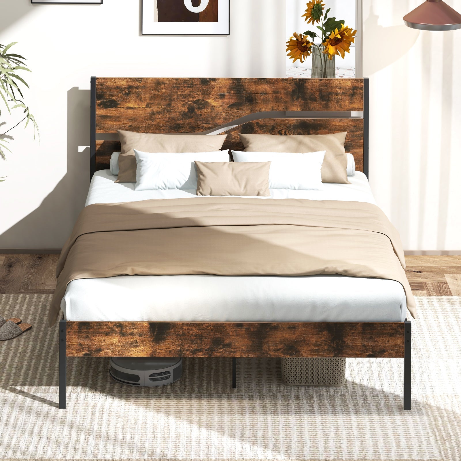 Single/Double/King Metal Bed Frame with Wooden Headboard and Footboard-Rustic Brown-King size
