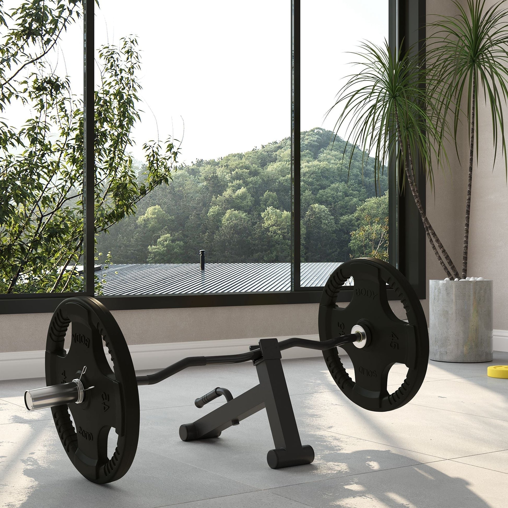 - A curl bar suitable for weight plates with 5cm holes and a 5cm wide barbell jack to hold a universal barbell bar