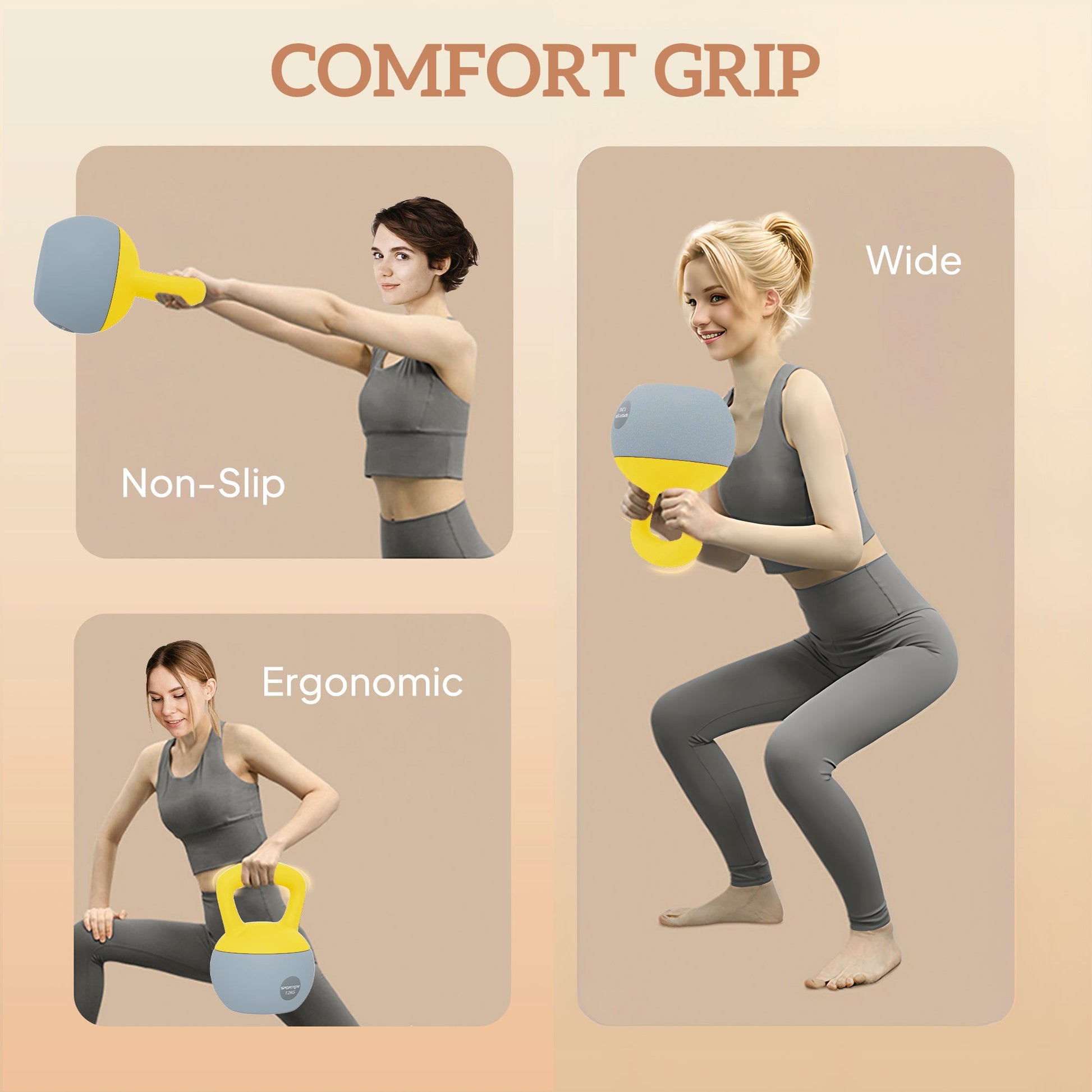 - Wide, ergonomic and non-slip handle, giving you complete control when handling the kettlebell