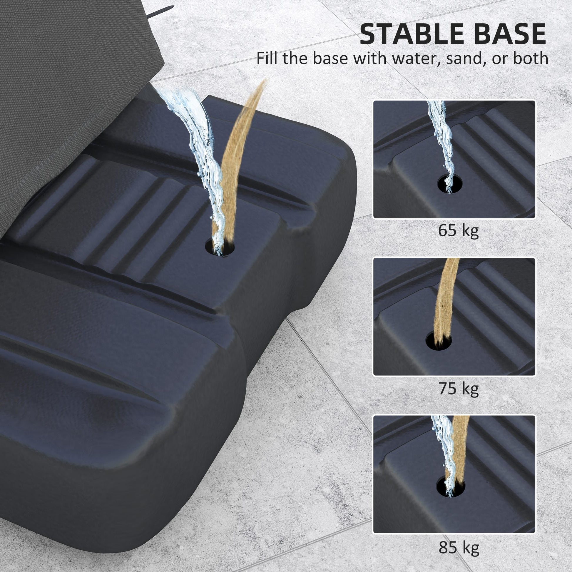 - Fill the base with 65kg of water, 75kg of sand or 85kg of water and sand