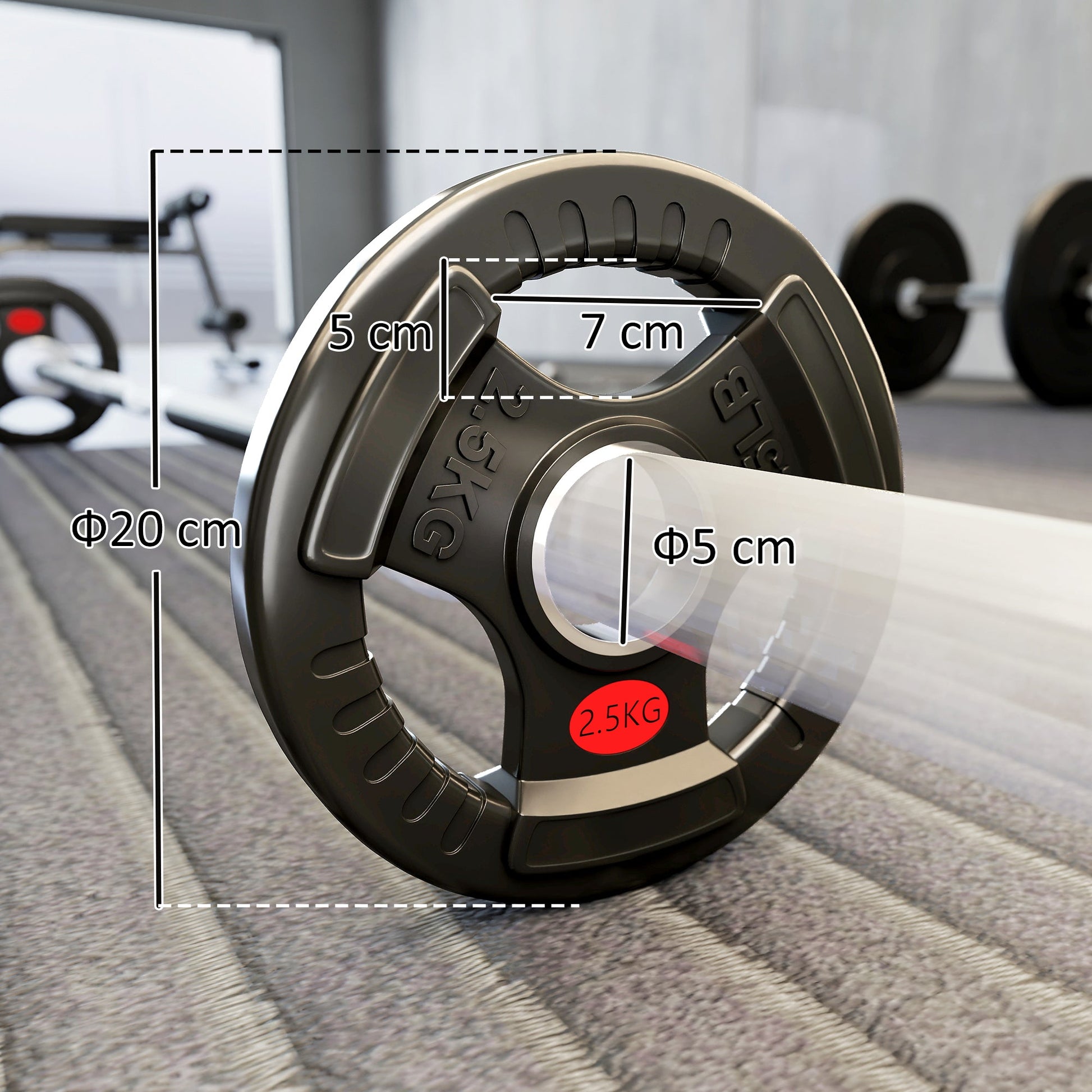 These SPORTNOW 2 x 2.5 kg Olympic weight plates are made from solid steel and feature a PVC coating for corrosion resistance, noise reduction and floor protection. Designed with three cut-out grip holes for easy handling, they fit all Olympic barbells with a 2" collar opening. Clear KG markings ensure easy identification and the versatile plates can also be used for a variety of exercises beyond barbell training.